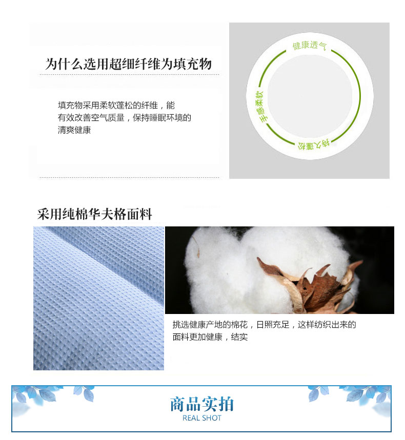 產(chǎn)品特點:內(nèi)含抗菌纖維,立體飽滿填充,蓬松高回彈,有效承托,不易變形,四季均可使用。