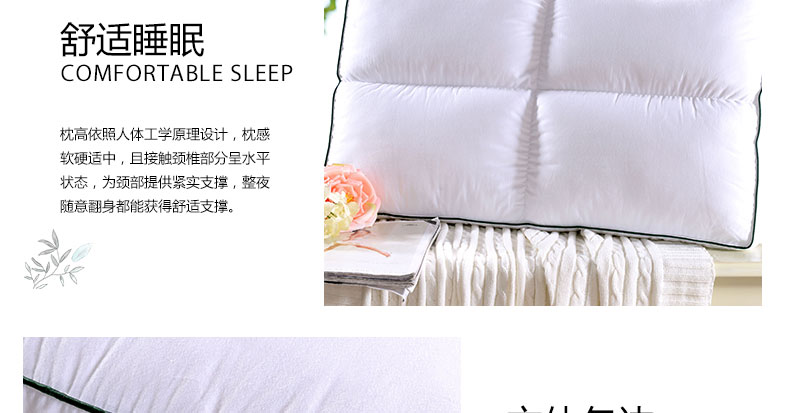 工藝:枕高依照人體工學原理設計,枕感軟硬適中,且接觸頸椎部分呈水平狀態(tài),為頸部提供緊實支撐,整夜隨意翻身都能獲得舒適支撐。