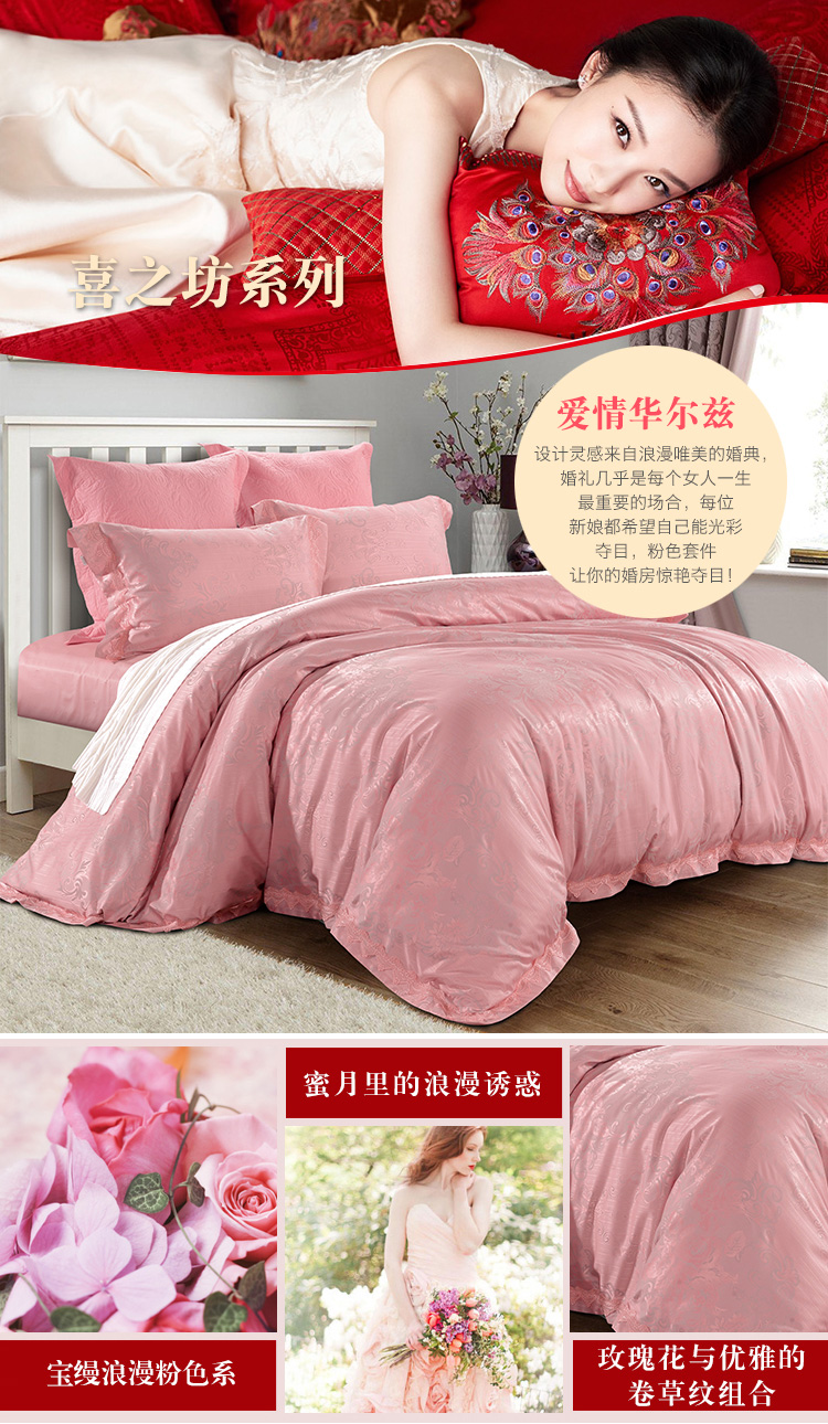 ?色彩生活,寶縵家紡!今日為你推薦是寶縵浪漫粉色系《愛情華爾茲》,設(shè)計靈感來自浪漫唯美的婚典,婚禮幾乎是每個女人一生最重要的場合,每位新娘都希望自己能光彩奪目,粉色套件讓你的婚房驚艷奪目!