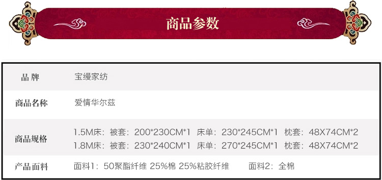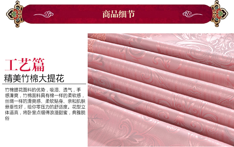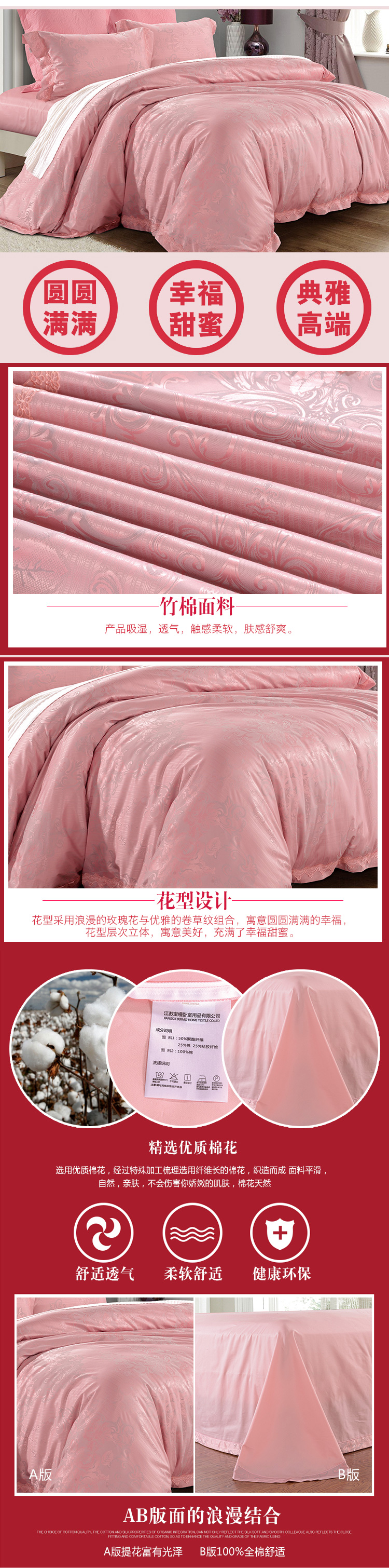 AB版設(shè)計:隨時隨地好心情,AB版枕套和被套正反面不同的圖案,為你的生活更添精彩!被面版面料采用精美竹棉大提花,竹棉提花面料的優(yōu)勢,吸濕、透氣,手感滑爽,竹棉面料具有棉一樣的柔軟感,絲綢一樣的滑爽感、柔軟貼身、親和肌膚,懸垂性好,給你零壓力的舒適度?;ㄐ土Ⅲw逼真,將臥室點綴得浪漫甜蜜,典雅脫俗。貼身版被套里布采用高支高密全棉緞紋面料,貼膚性好,柔軟舒適,給你溫馨的肌膚觸碰。