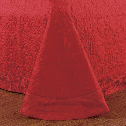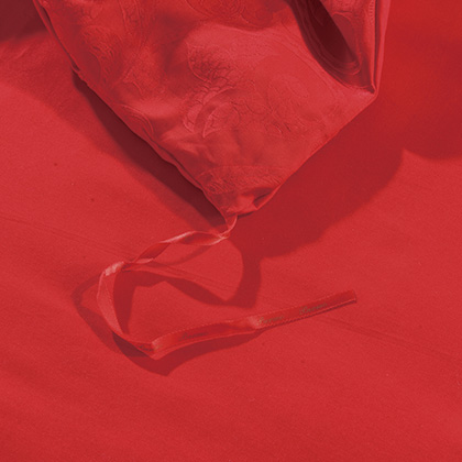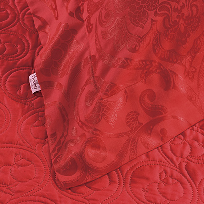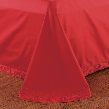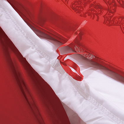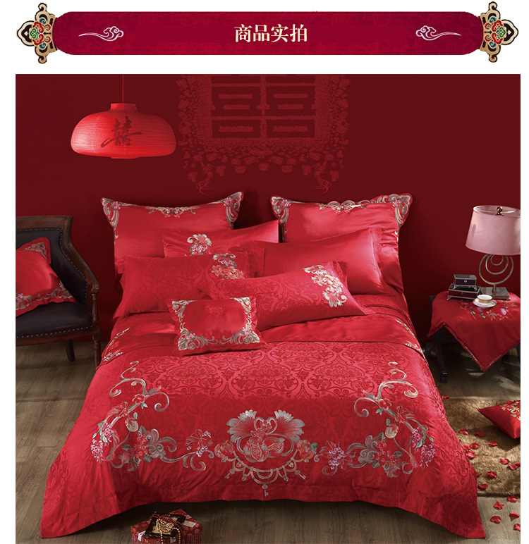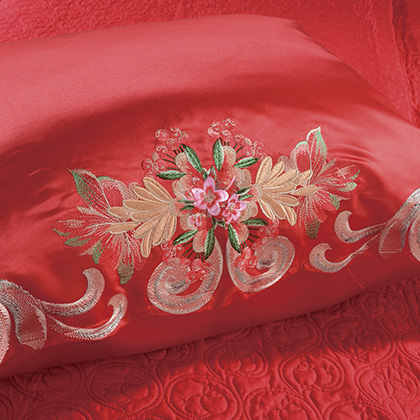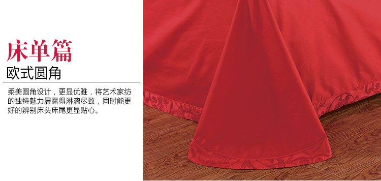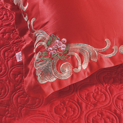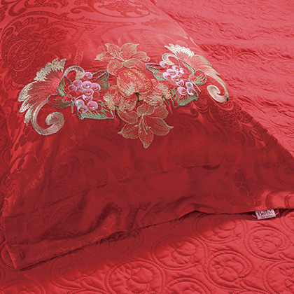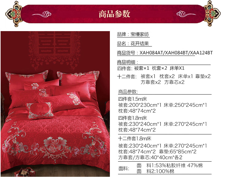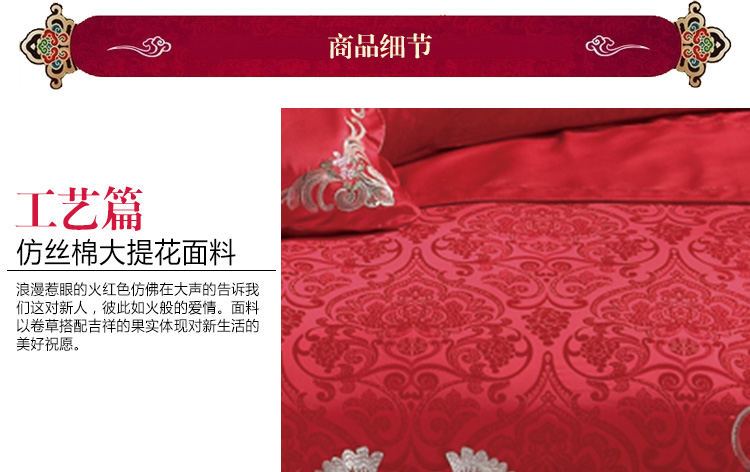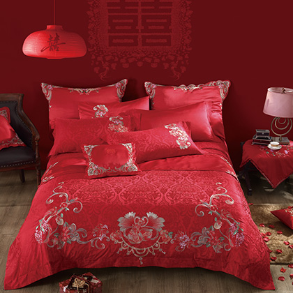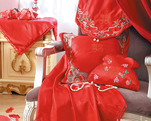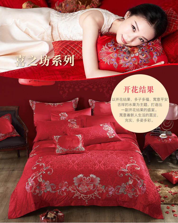 B、美女,你看這里(被套),采用喜慶的中國紅為底色,寓意著生活的紅紅火火。面料以卷草搭配吉祥的果實體現(xiàn)對新生活的美好祝愿。