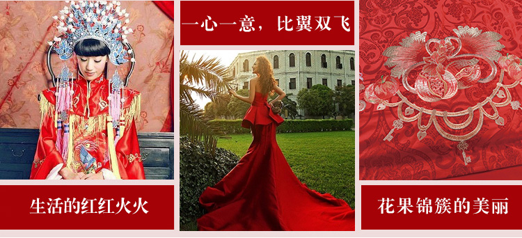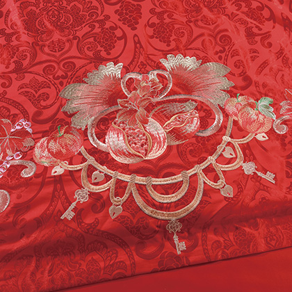 ?首先印入我們眼簾的是它濃烈的火紅色,中國傳統(tǒng)的顏色,浪漫惹眼的火紅色仿佛在大聲的告訴我們這對新人,彼此如火般的愛情。面料以卷草搭配吉祥的果實體現(xiàn)對新生活的美好祝愿。