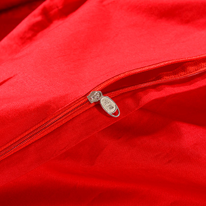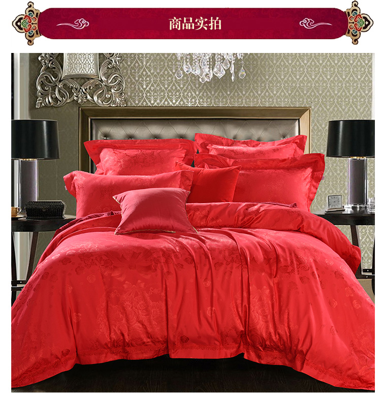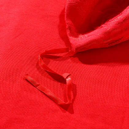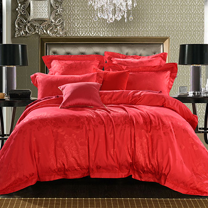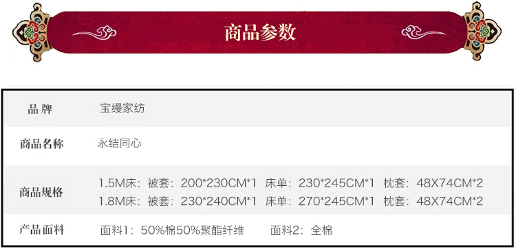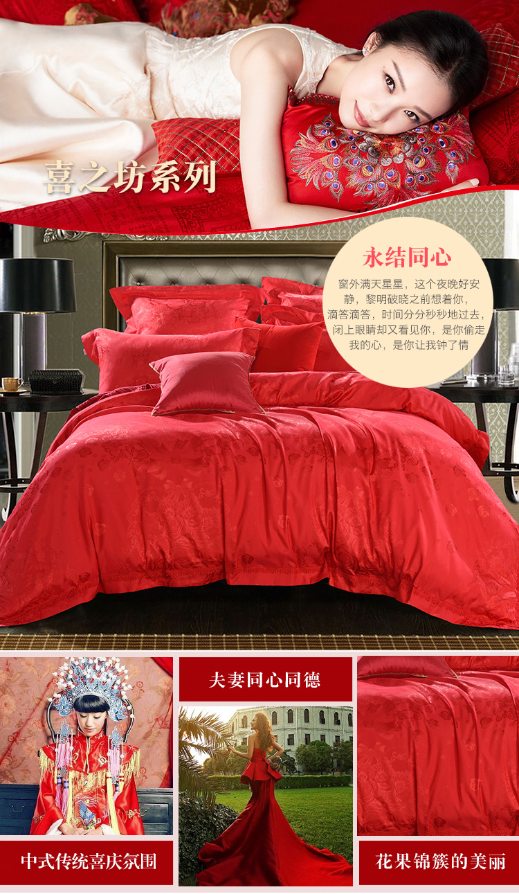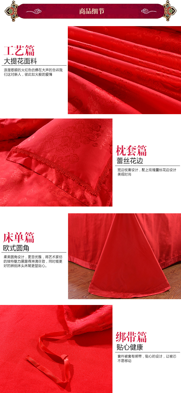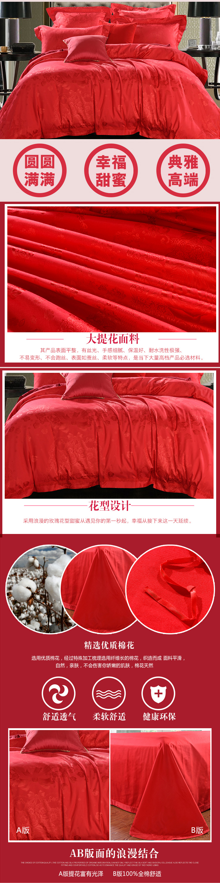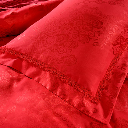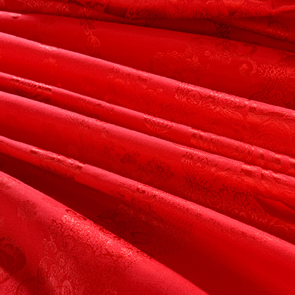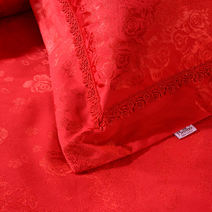 花型:突出提花花型,傳統(tǒng)的中國大紅配上錦簇的團圓玫瑰花,加上歐式底紋和象征夫妻同心同德的同心結(jié),既符合中式傳統(tǒng)喜慶氛圍,又符合現(xiàn)代人的審美心理,預(yù)示著一對新人團團圓圓,和和氣氣,實為現(xiàn)代人追求美好婚姻的喜慶佳品。