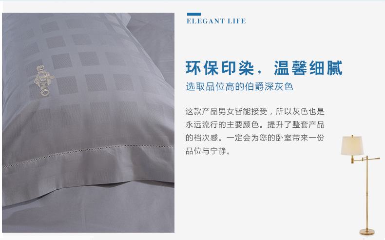 這款產品的顏色選取品位極高的伯爵深灰色?;疑?Gray具有柔和,高雅的意象,象征誠懇、沉穩(wěn)、考究。而且屬于中間性格,男女皆能接受,所以灰色也是永遠流行的主要顏色。它不但提升了整套產品的檔次感。還為您的臥室?guī)硪环萜肺慌c寧靜。