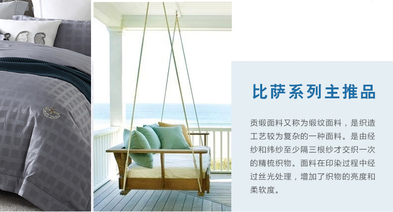 A、你好,您的眼光真好,你看上的這款是我們今年比薩的主推品---波瀾!這款產品采用高支高密全棉提花面料,全棉面料的特性為質地柔軟、表面平滑、透氣性能佳,親膚舒適度很高。