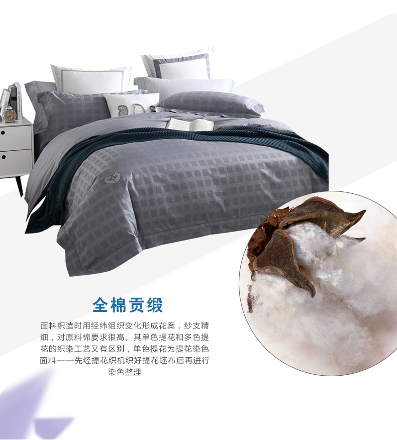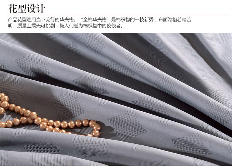 第三:面料織造時用經緯組織變化形成花案,紗支精細,對原料棉要求極高。其單色提花和多色提花的織染工藝又有區(qū)別,單色提花為提花染色面料——先經提花織機織好提花坯布后再進行染色整理。而色織提花則先經染色,再織成花紋,其色彩牢度高,是全棉產品里面的高檔產品,面料厚度感好,有質感,正反兩面的顏色正好相反,立體感強 ,縮水率小其產品不起球,不掉色。
