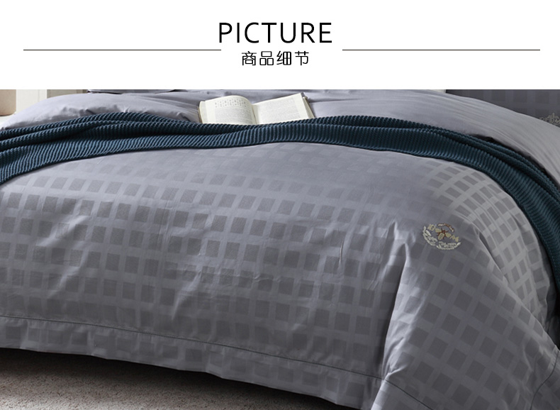 C、美女,您再看這被面,被面繡花用到了時尚的蜜蜂圖案,結合寶縵標識,精致大牌,提升了整套產品的氣場。細節(jié)上選用刁孔工藝,極致簡約又不失品質感。