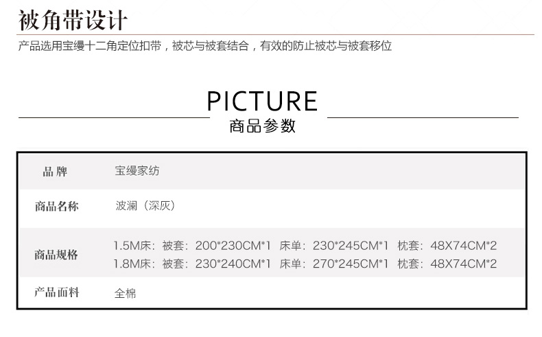 第四:產品選用寶縵十二角定位扣帶,被芯與被套完美結合,有效的防止被芯與被套移位,晚上休息您就不用擔心的被芯會跑來跑去,您可以很快的進入夢鄉(xiāng)了。