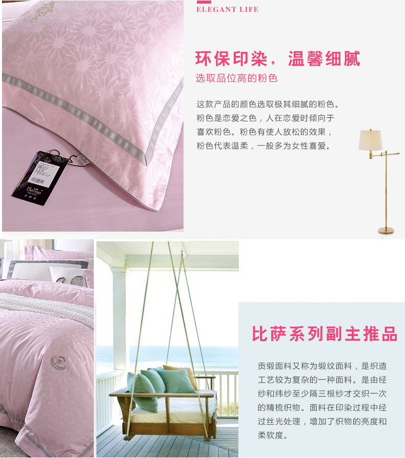 第四:這款產(chǎn)品的顏色選取極其細(xì)膩的粉色。粉色是戀愛(ài)之色,人在戀愛(ài)時(shí)傾向于喜歡粉色。粉 色有使人放松的效果,粉色代表溫柔,一定會(huì)為您的臥室?guī)?lái)一份溫暖與寧?kù)o。