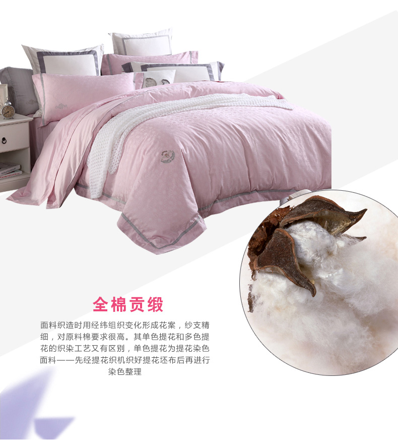 ?純棉提花面料上的花紋不是普通印花,也不是繡花,而是用紗線織出來(lái)的。 面料織造時(shí)用經(jīng)緯組織結(jié)構(gòu)變化、經(jīng)紗和緯紗相互交織沉浮構(gòu)成不同的圖案,形成 花案,紗支精細(xì),針線密度高。其布料一般很薄不是厚,而且很柔軟,很密,對(duì)棉花的要求很高,要求紗織更細(xì),一般市場(chǎng)上用40s左右,此款采用達(dá)到60支以上,先織后染工藝貢緞提花面料的表面凹凸有致,能用經(jīng)/緯線織造出花、鳥、魚、蟲、飛禽走獸等美麗圖案。質(zhì)地柔軟、細(xì)膩、爽滑的獨(dú)特質(zhì)感,光澤度好,懸垂性及透氣性好,色牢度高。面料的圖案幅度大且精美,色彩層次分明立體感強(qiáng)。 使用起來(lái)不變形,不褪色,舒適感好。