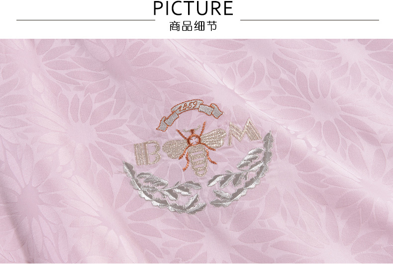 第三:產(chǎn)品被面繡花用到了時(shí)尚的蜜蜂圖案,蜜蜂代表著勤勞與甜蜜,結(jié)合寶縵標(biāo)識(shí),精致大牌,提升了整套產(chǎn)品的氣場(chǎng)。
