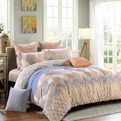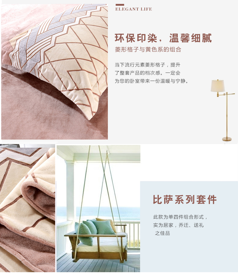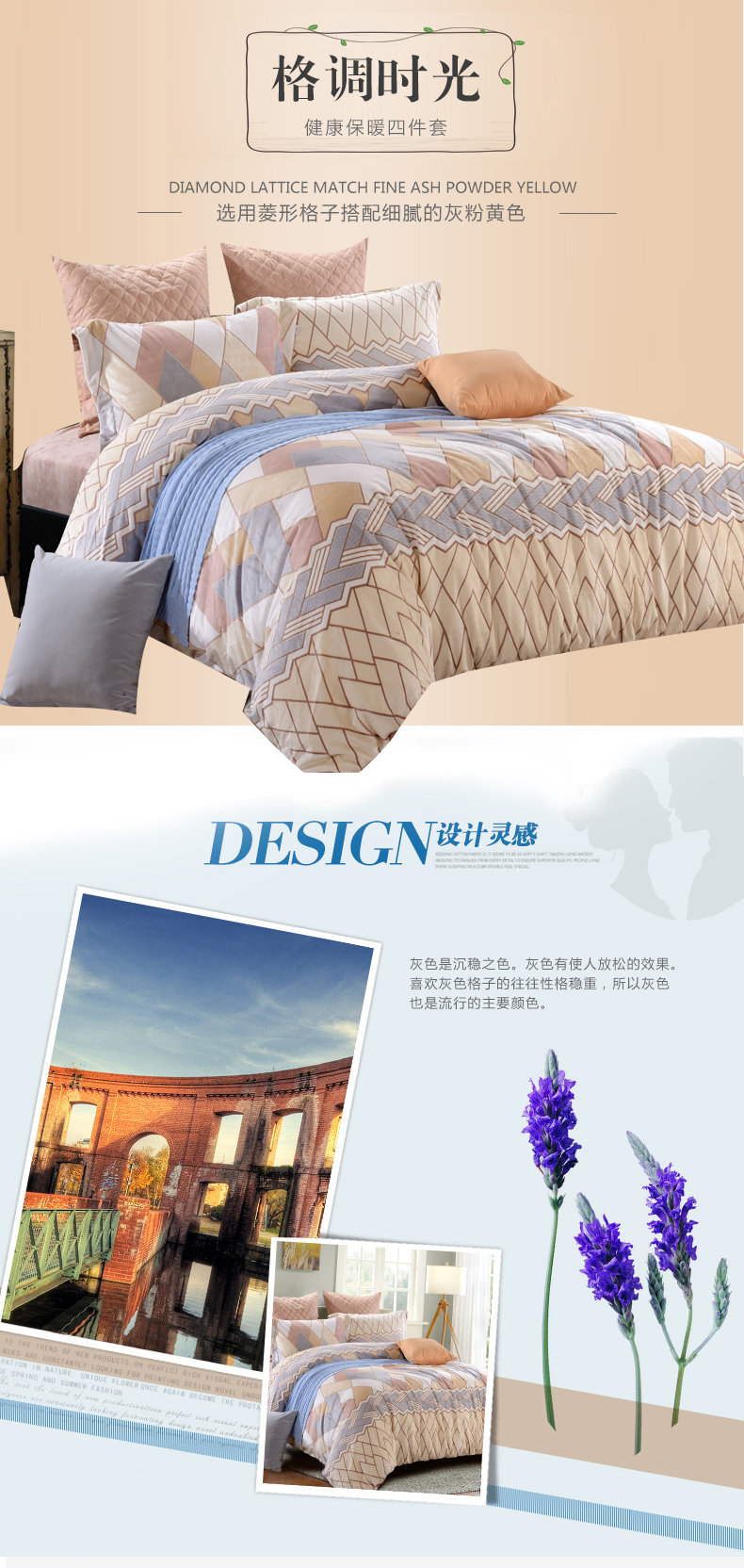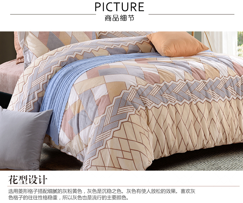 工藝:當(dāng)下流行元素菱形格子,提升了整套產(chǎn)品的檔次感。一定會為您的臥室?guī)硪环轀嘏c寧靜。