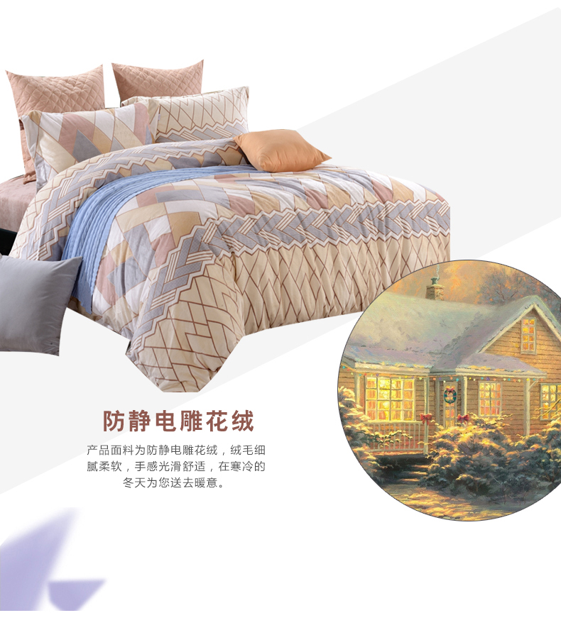 面料:產(chǎn)品面料為防靜電雕花絨,絨毛細膩柔軟,手感光滑舒適,在寒冷的冬天為您送去暖意。