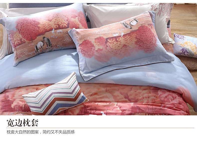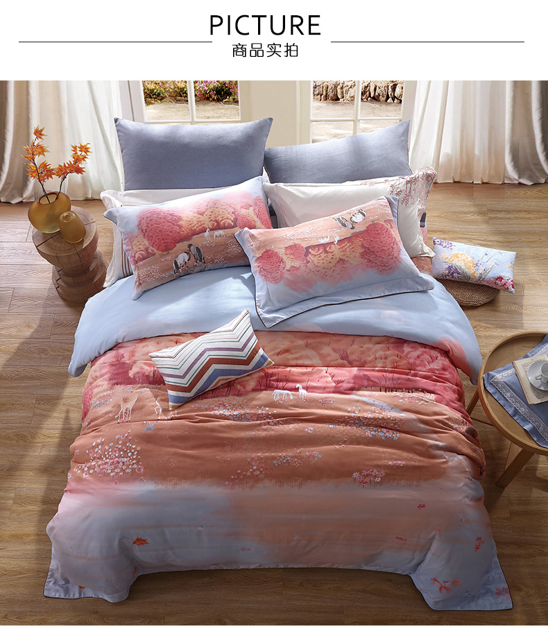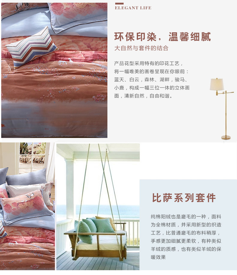 第一:產(chǎn)品花型采用特有的獨版印花工藝,將一幅唯美的畫卷呈現(xiàn)在你眼前:藍(lán)天、白云,森林、湖畔,駿馬、小鹿,構(gòu)成一幅三位一體的立體畫面,清新自然,自由和諧。