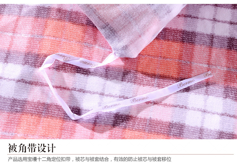 第四:產(chǎn)品選用寶縵十二角定位扣帶,被芯與被套完美結(jié)合,有效的防止被芯與被套移位,晚上休息您就不用擔心的被芯會跑來跑去,您可以很快的進入夢鄉(xiāng)了。