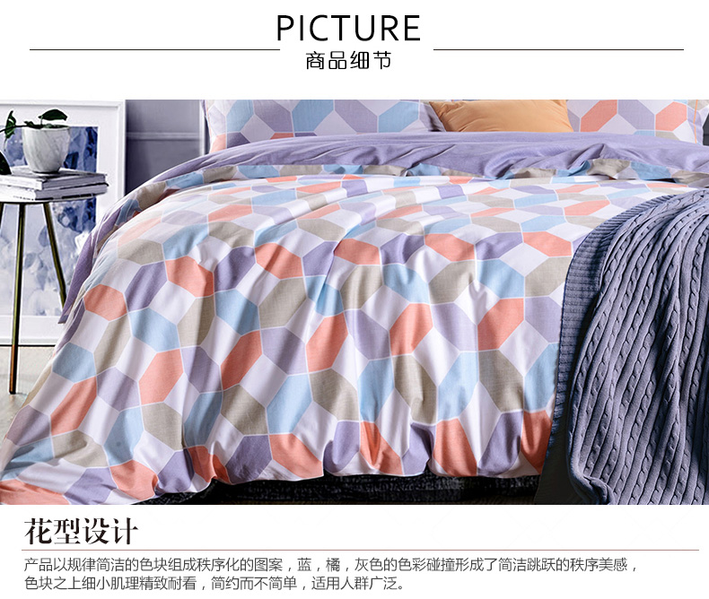 產(chǎn)品以規(guī)律簡(jiǎn)潔的色塊組成秩序化的圖案,藍(lán),橘,灰色的色彩碰撞形成了簡(jiǎn)潔跳躍的秩序美感,色塊之上細(xì)小肌理精致耐看,簡(jiǎn)約而不簡(jiǎn)單,適用人群廣泛。