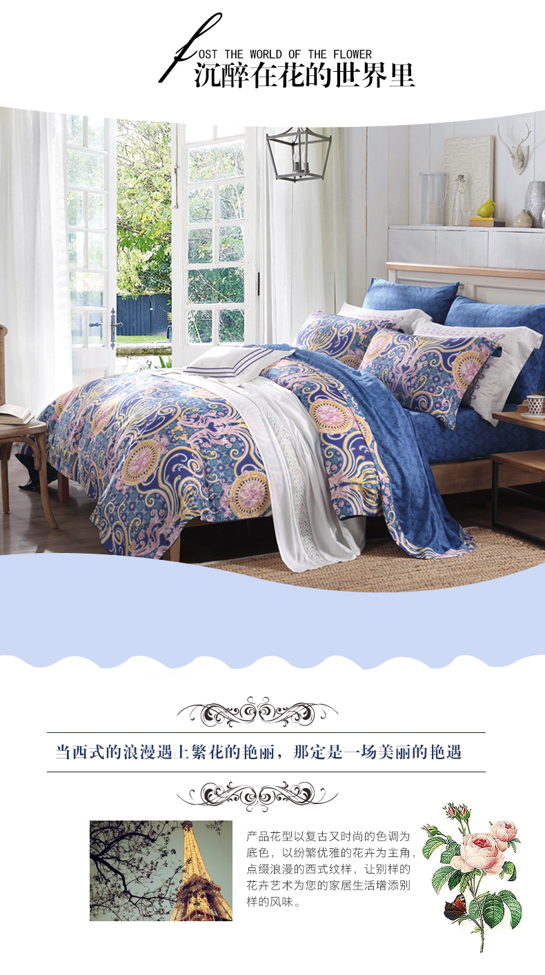 花型:以復(fù)古又時(shí)尚的色調(diào)為底色,以紛繁優(yōu)雅的花卉為主角,點(diǎn)綴浪漫的西式紋樣,讓別樣的花卉藝術(shù)為您的家居生活增添別樣的風(fēng)味。