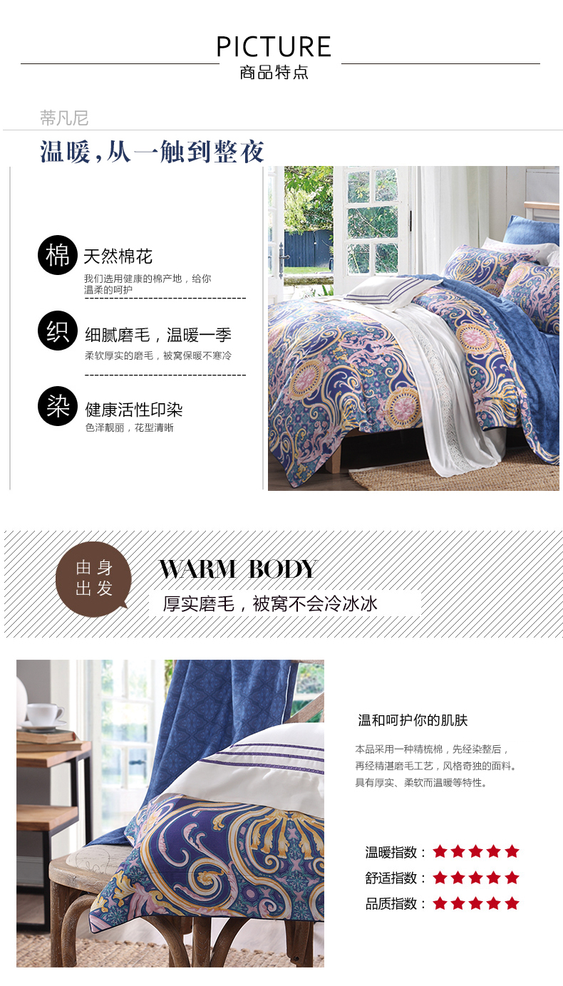 面料:此款產(chǎn)品采用高檔精梳棉,先經(jīng)染整后,再經(jīng)精湛磨毛工藝,風(fēng)格奇獨(dú)的面料。具有厚實(shí)、柔軟而溫暖等特性。