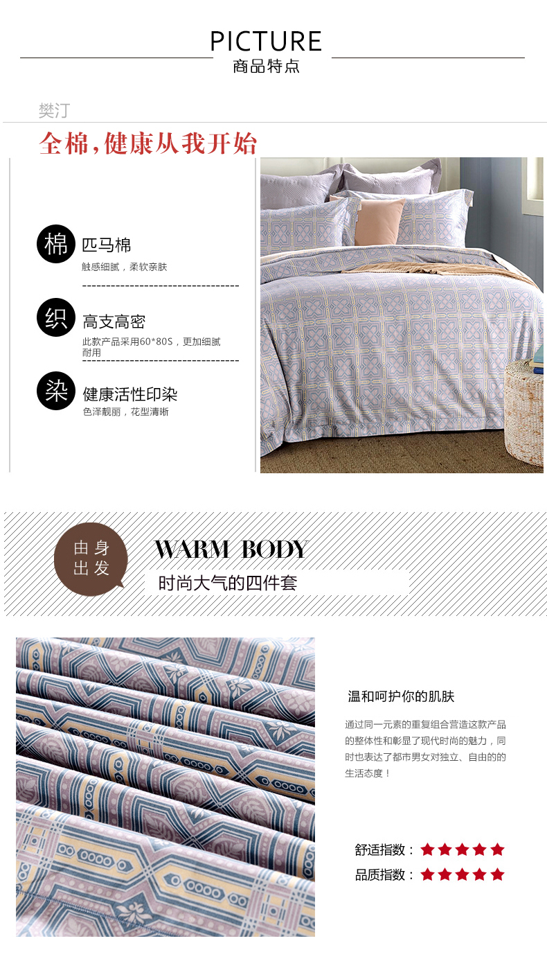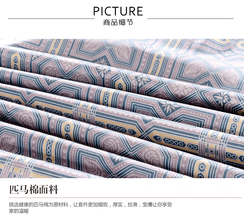 面料:1. 此款產(chǎn)品采用80S匹馬棉面料,原料采用美國進口匹馬棉,具有特殊絲光效果,純手工采摘,純天然材質(zhì),觸感細膩,柔軟親膚。