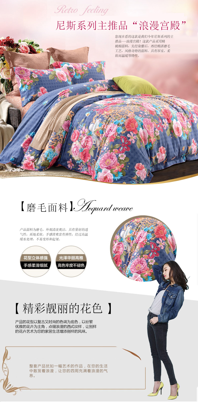 A、您好,很高興為您服務(wù),您現(xiàn)在看的這款是我們今年尼斯系列的主推品---浪漫宮殿!這款產(chǎn)品采用高檔精梳棉面料,先經(jīng)染整后,再經(jīng)精湛磨毛工藝,風(fēng)格奇特的面料。具有厚實(shí)、柔軟而溫暖等特性。