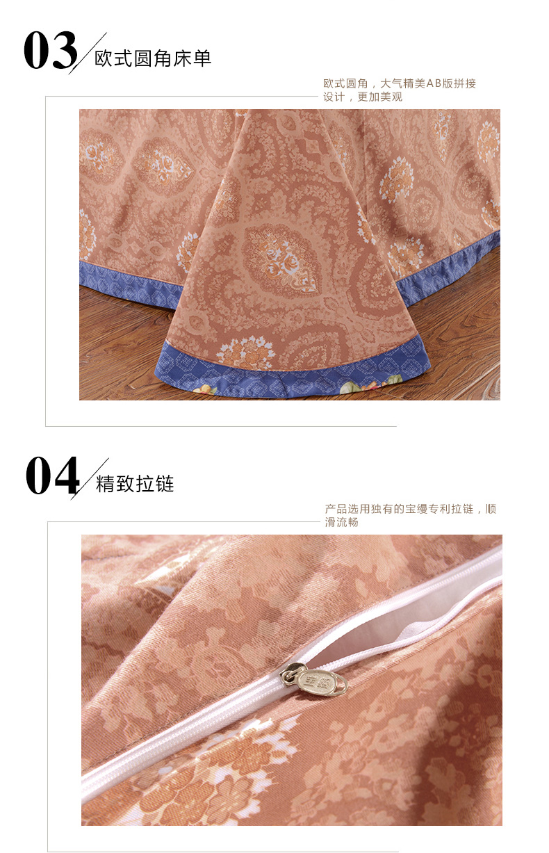 第三:同色系寶縵十二角定位扣帶,被芯與被套完美結(jié)合,有效的防止被芯與被套移位,晚上休息您就不用擔(dān)心的被芯會(huì)跑來跑去,您可以很快的進(jìn)入夢鄉(xiāng)了。