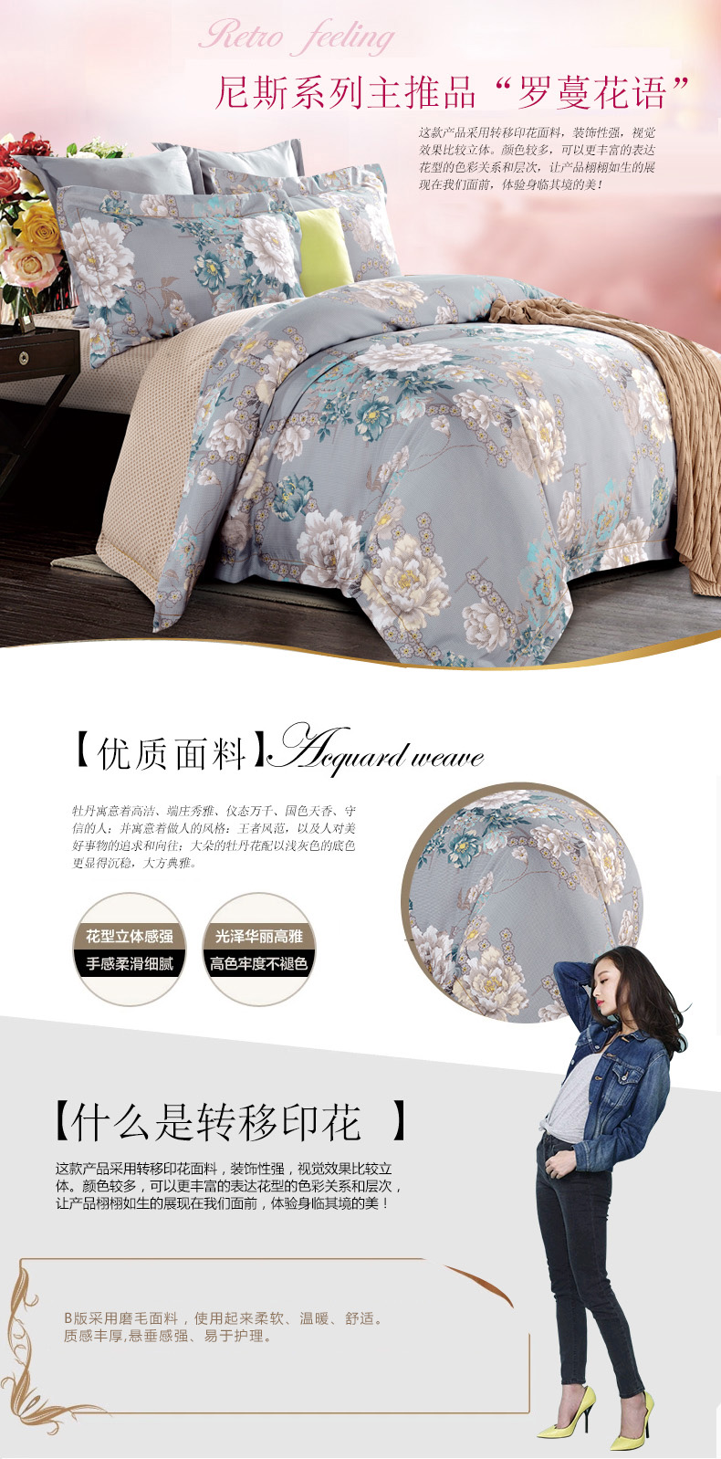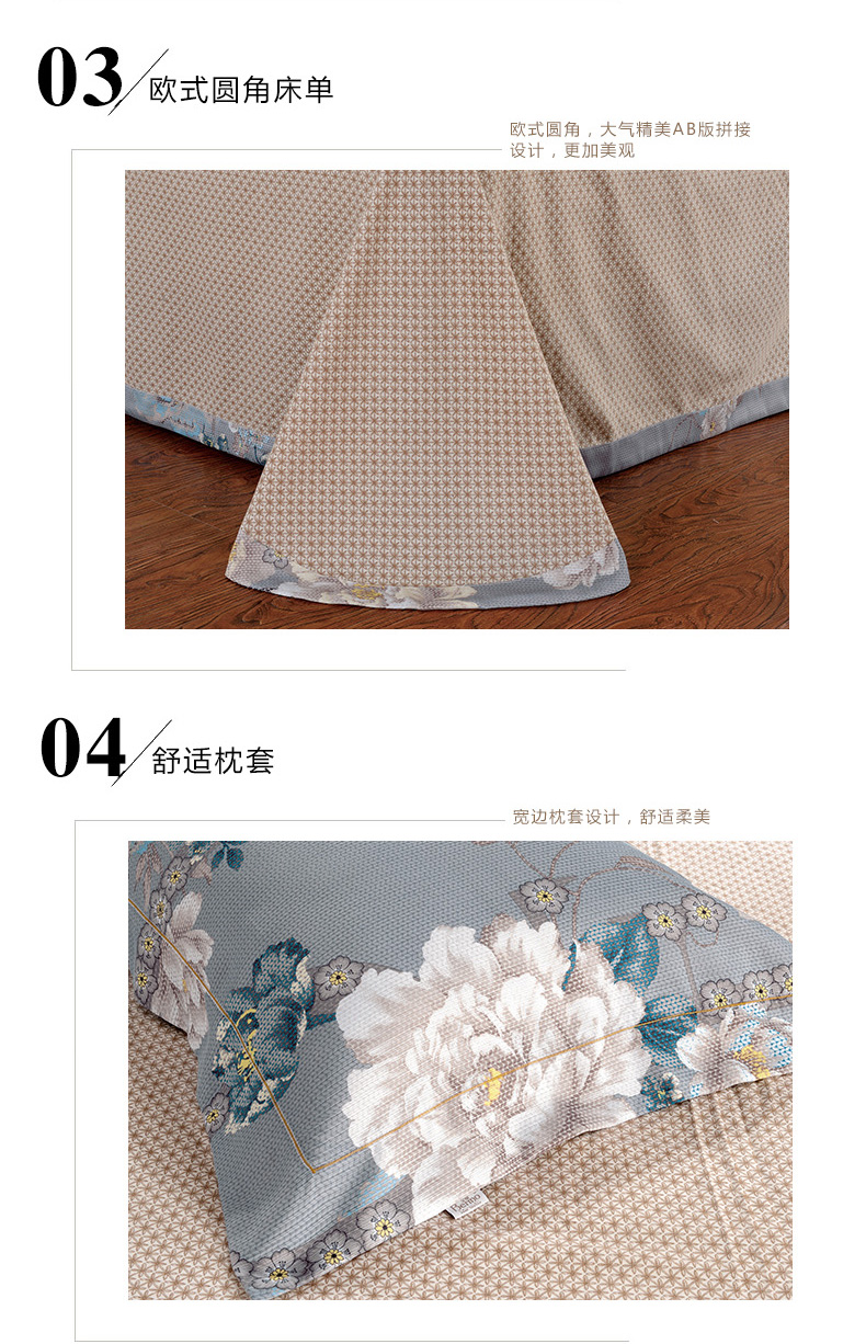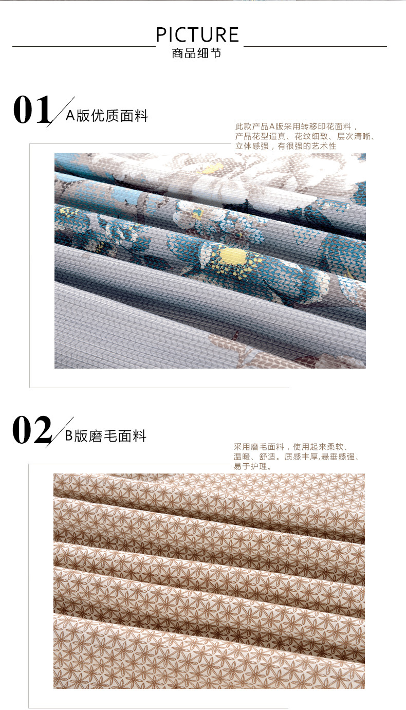 面料:此款產品A版采用轉移印花面料,產品花型逼真、花紋細致、層次清晰、立體感強,有很強的藝術性,B版采用磨毛面料,使用起來柔軟、溫暖、舒適。質感豐厚,懸垂感強、易于護理。