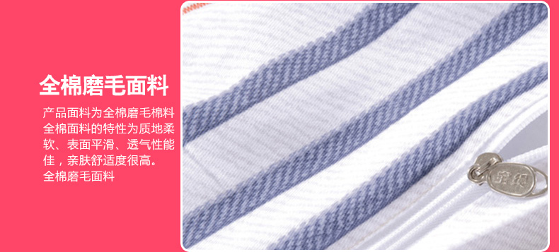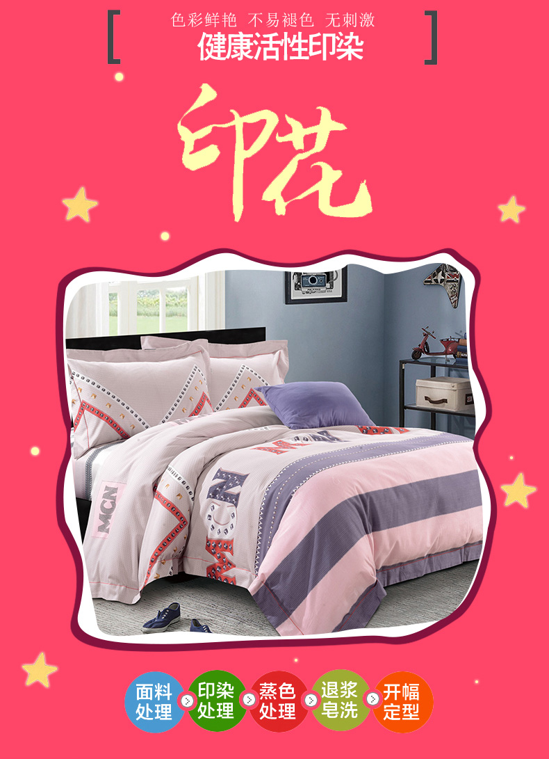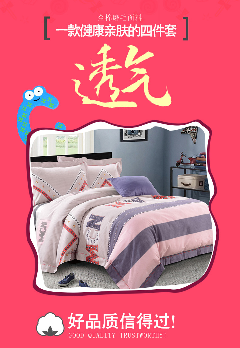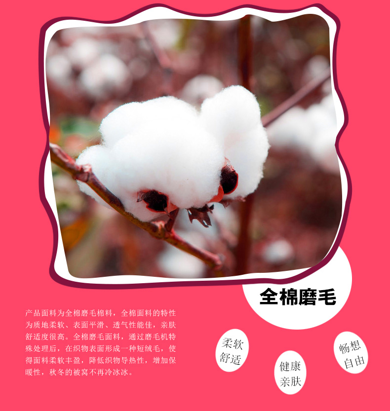 1.產(chǎn)品面料為磨毛印花,它的手感柔軟、舒適、質(zhì)感豐厚,懸垂感強(qiáng)、易于護(hù)理、絨面豐盈的特點(diǎn)吸引著消費(fèi)者,特別在使用時很貼身,一種暖暖,柔柔的舒服感覺,顏色歷久彌新,由于工藝獨(dú)特,磨毛產(chǎn)品不會褪色,起球等品質(zhì),比一般的全棉布料優(yōu)得多,而且重量也要比一般的全棉料厚重許多。