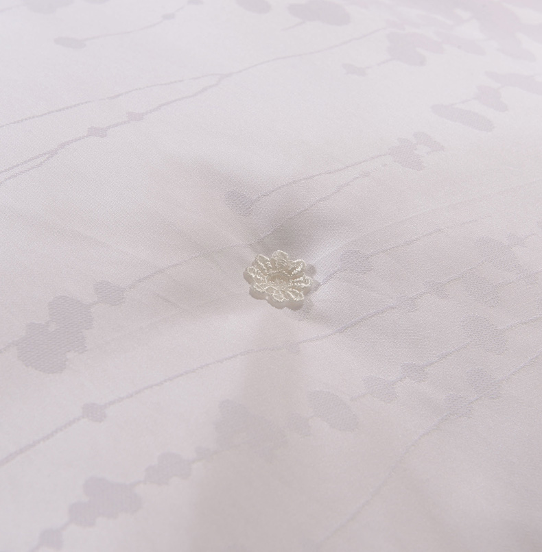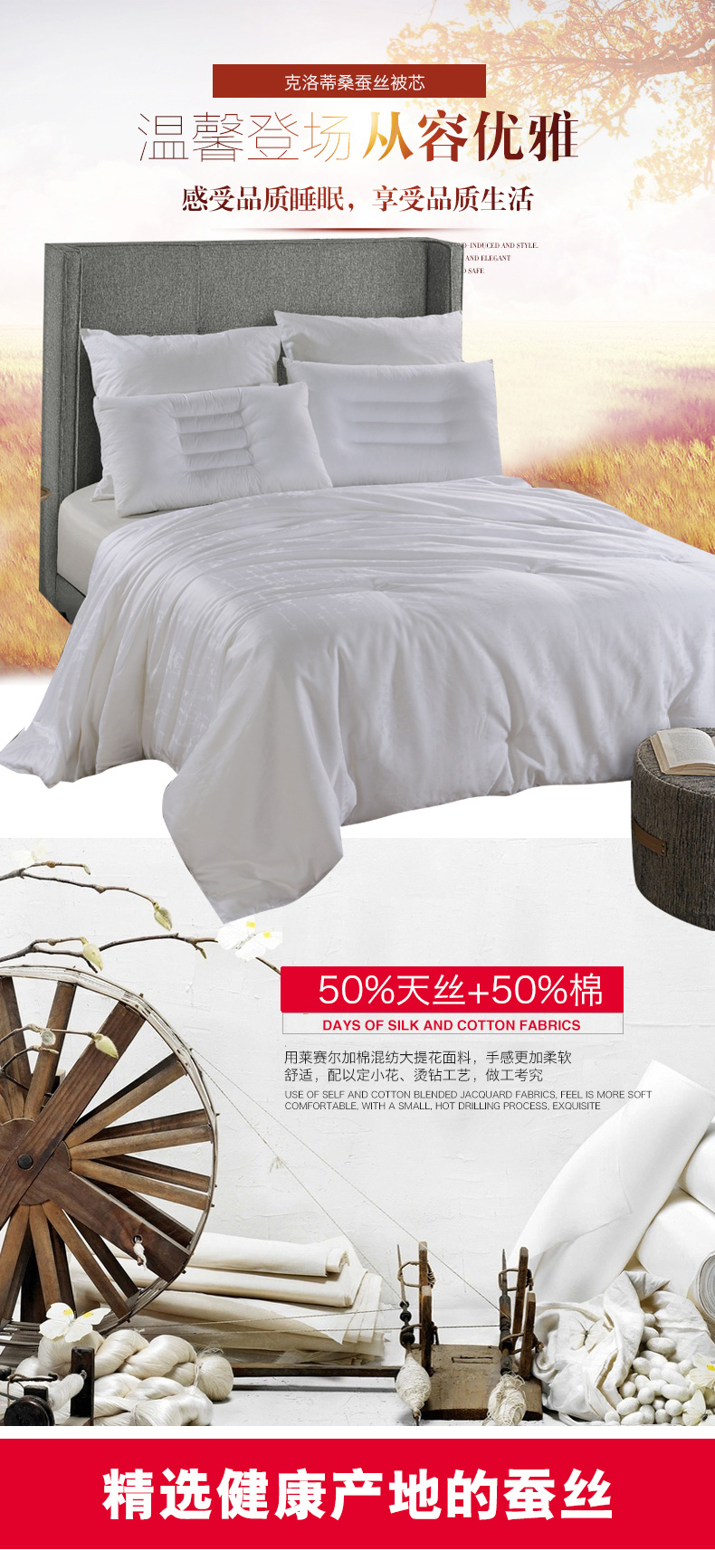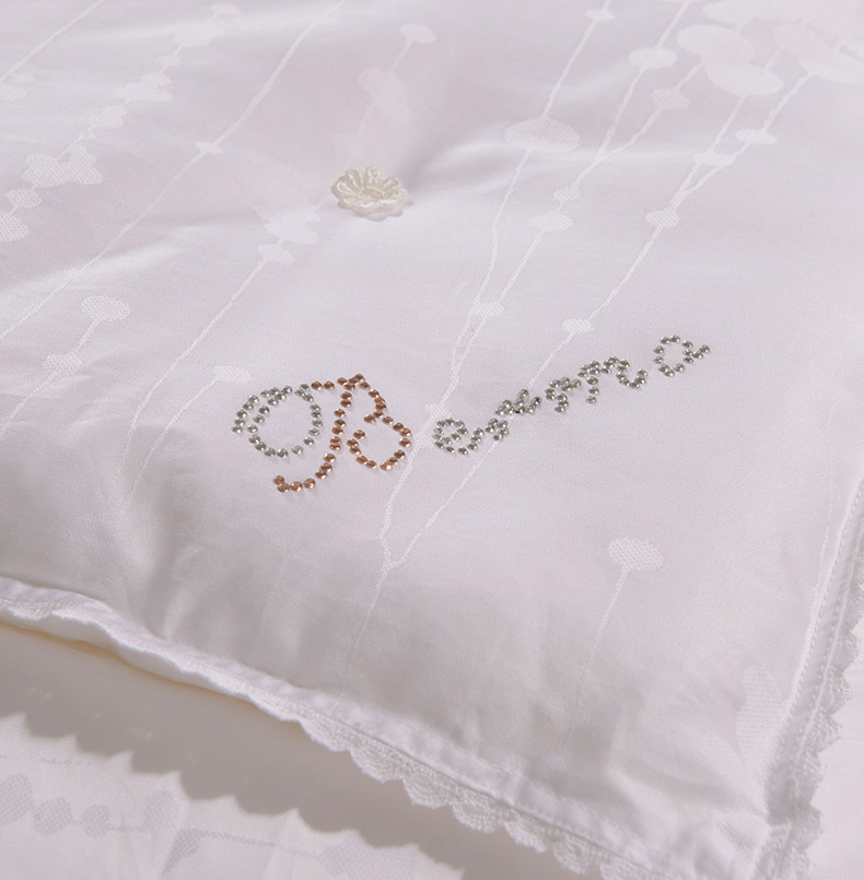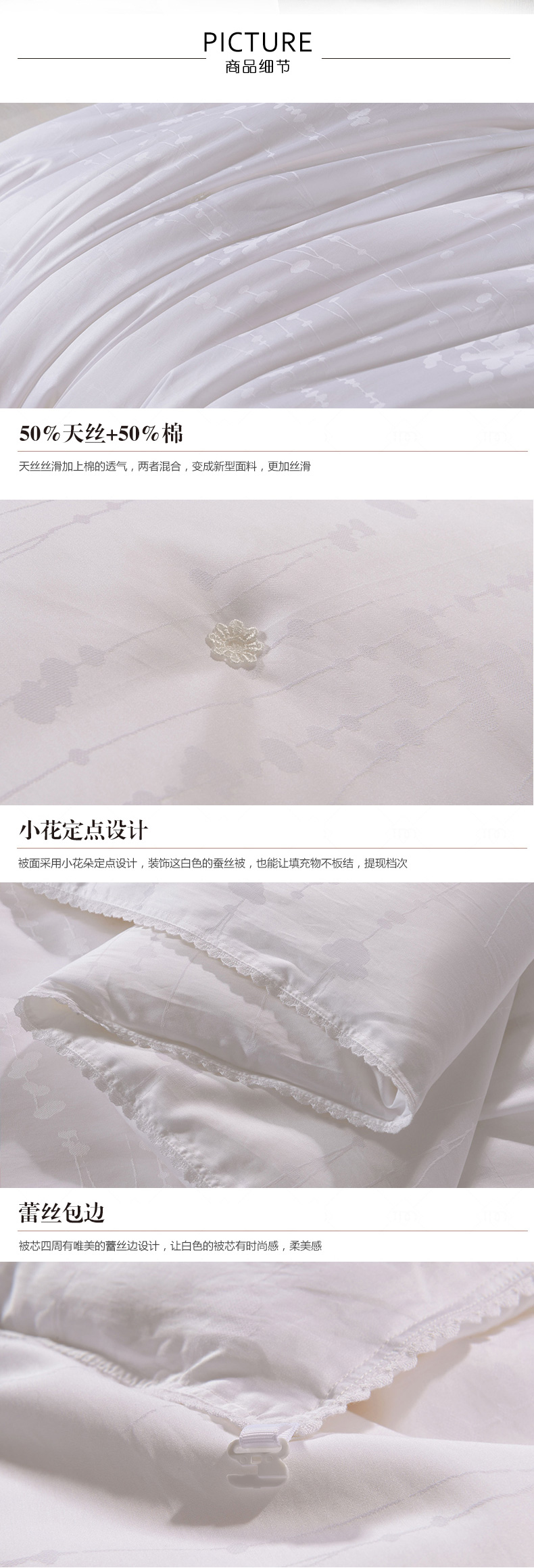 產(chǎn)品特點:采用萊賽爾加棉混紡大提花面料,手感更加柔軟舒適,配以定小花、燙鉆工藝,做工考究。填充為上等桑蠶絲長絲雙宮繭,既保暖又不宜起團,不易變形。