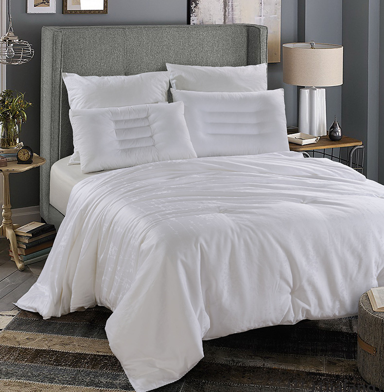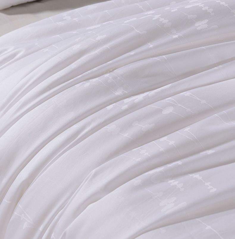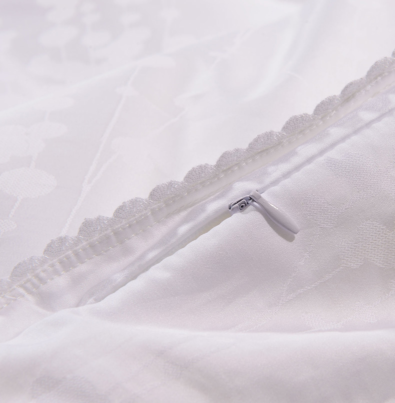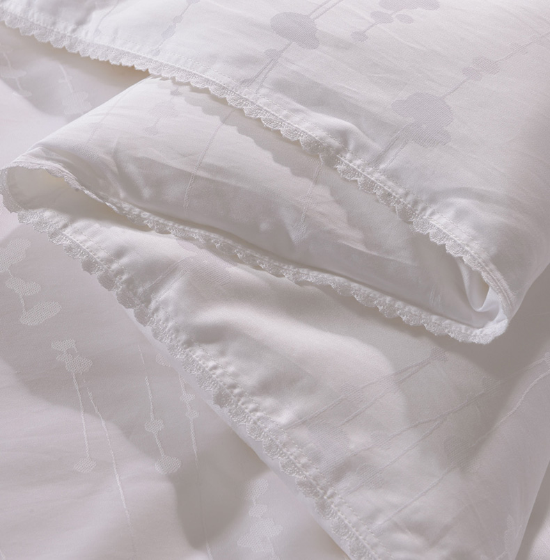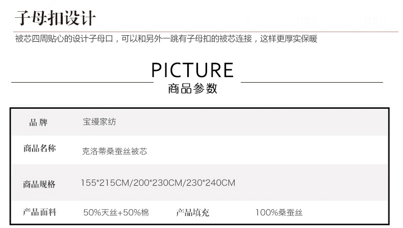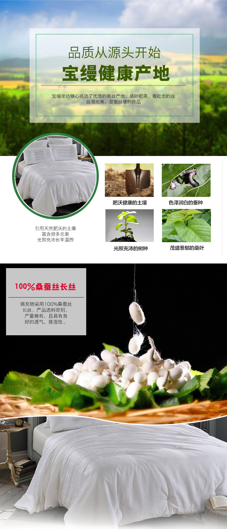 產(chǎn)品特點:采用萊賽爾加棉混紡大提花面料,手感更加柔軟舒適,配以定小花、燙鉆工藝,做工考究。填充為上等桑蠶絲長絲雙宮繭,既保暖又不宜起團,不易變形。