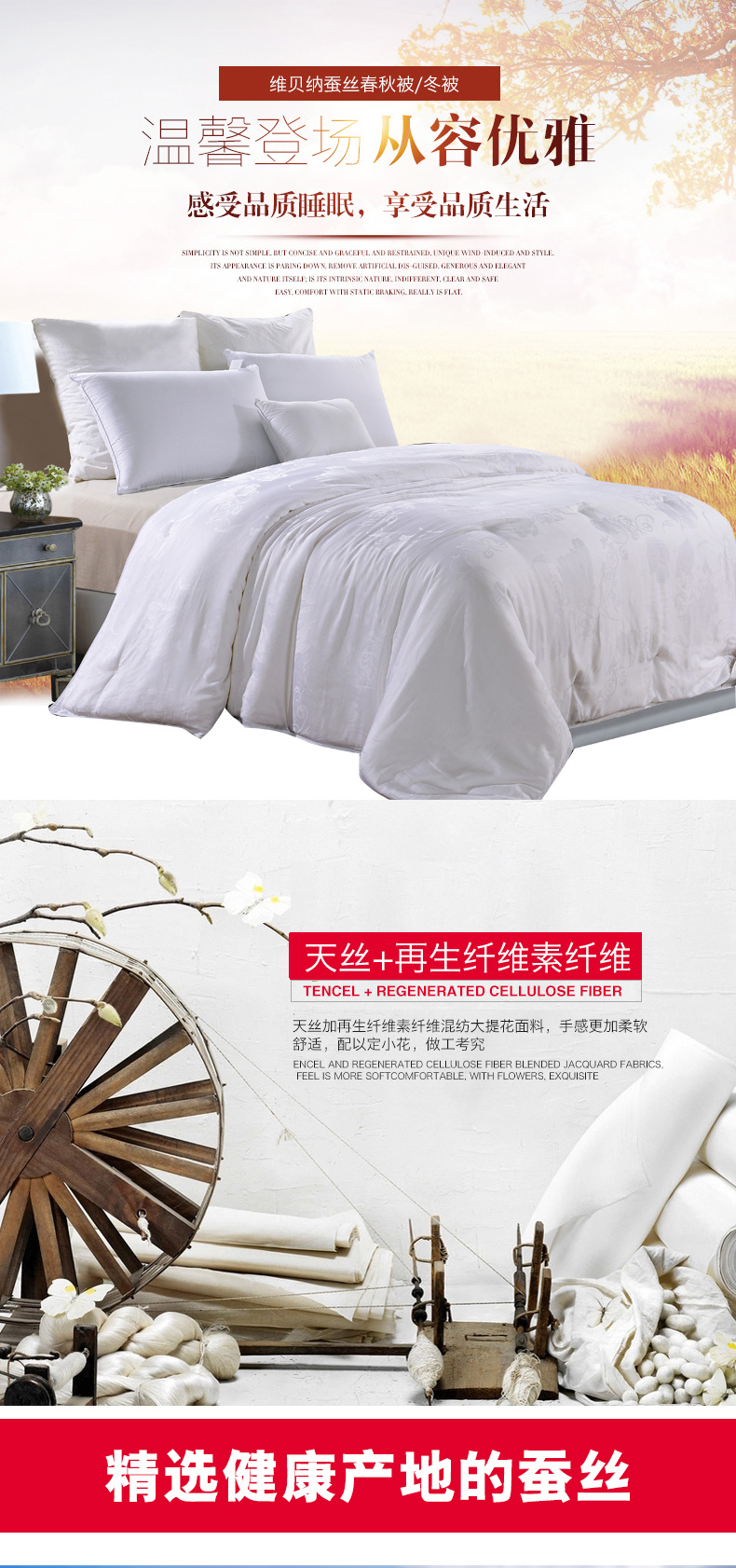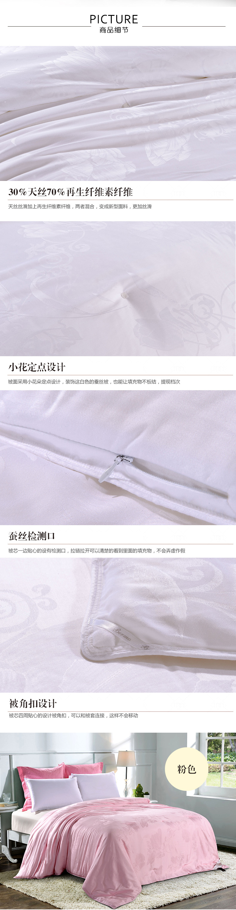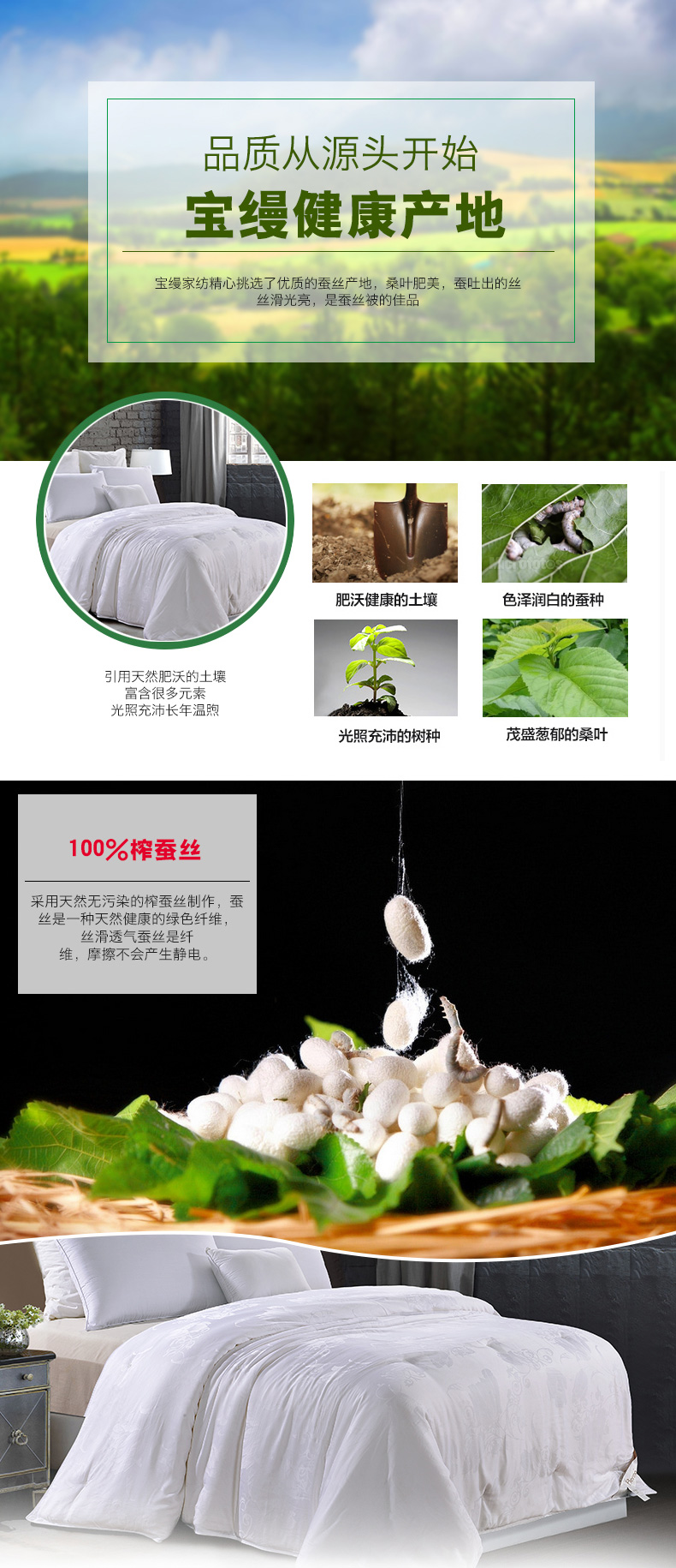 產(chǎn)品特點(diǎn):采用天然無(wú)污染的榨蠶絲制作,蠶絲是一種天然健康的綠色纖維,抗菌防螨,絲滑透氣蠶絲是蛋白纖維,摩擦不會(huì)產(chǎn)生靜電。
