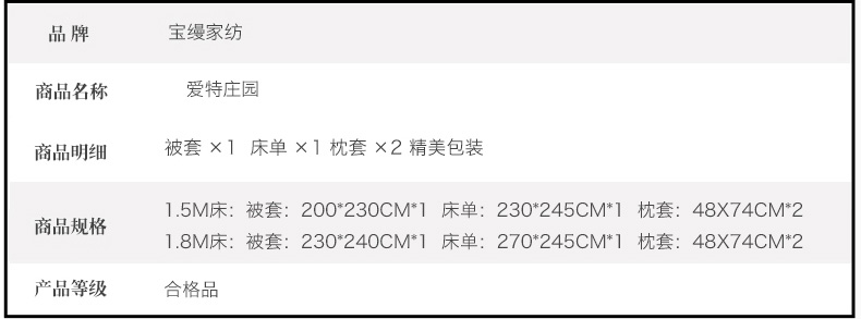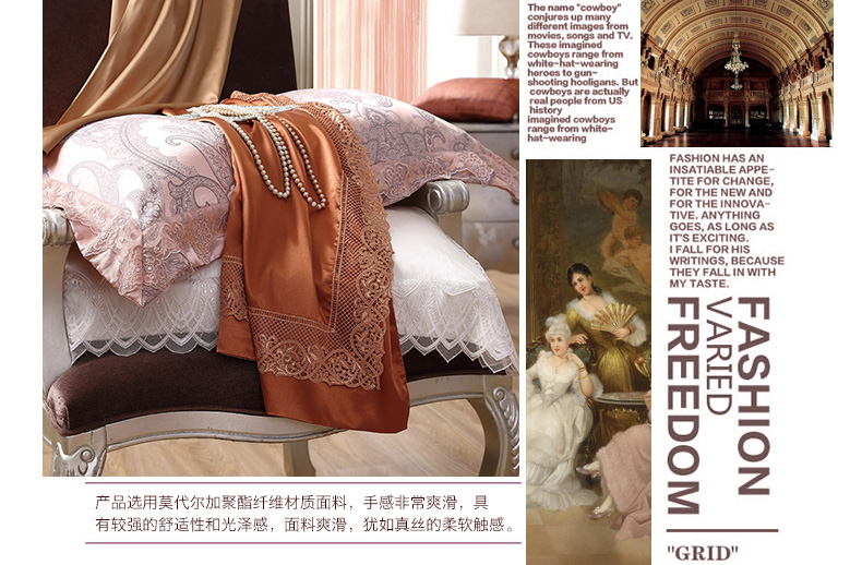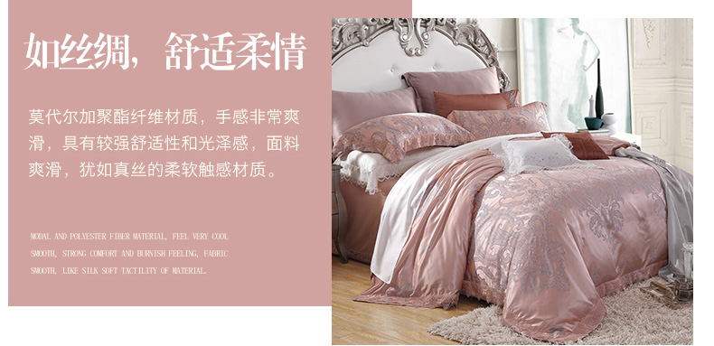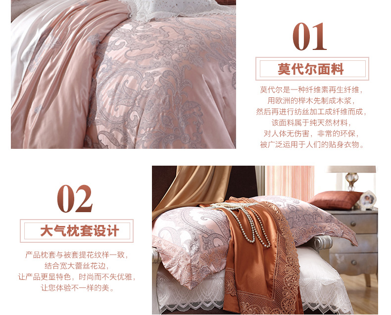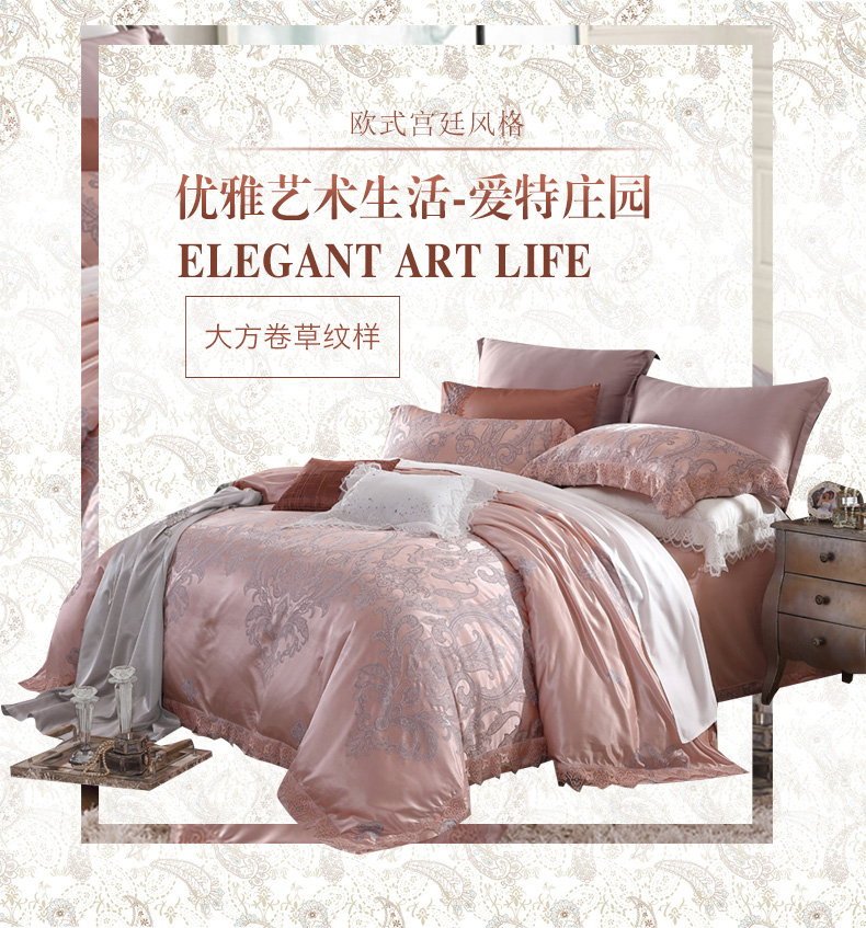 第三:產(chǎn)品枕套與被套提花紋樣一致,結(jié)合寬大蕾絲花邊,讓產(chǎn)品更顯特色,時尚而不失優(yōu)雅,讓您體驗不一樣的美。