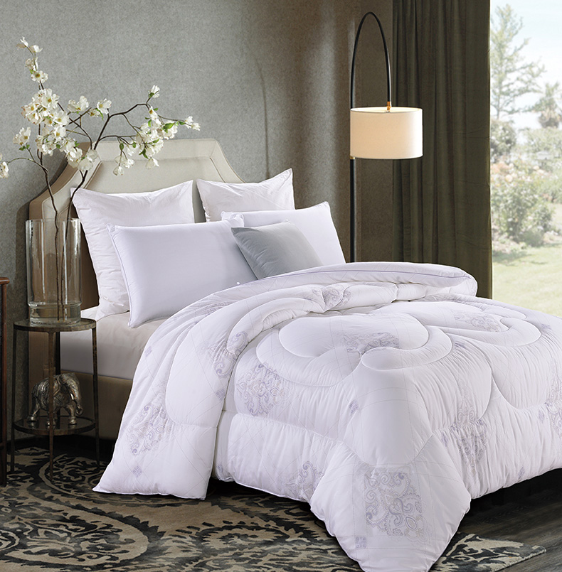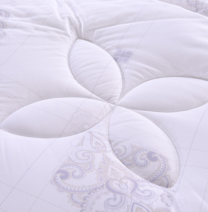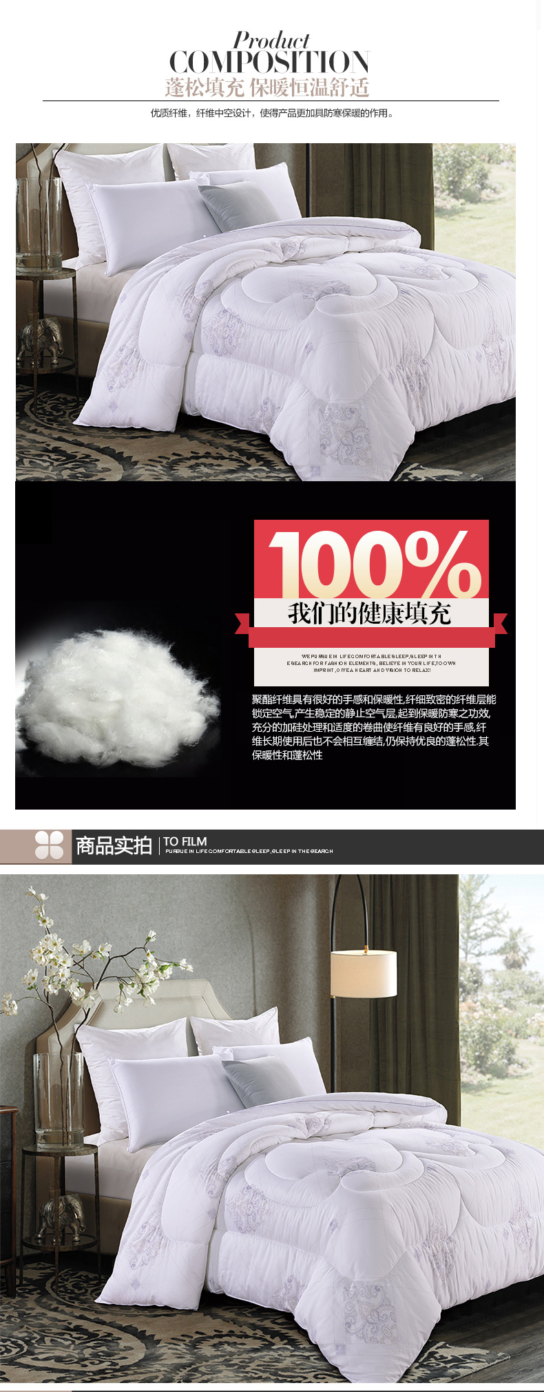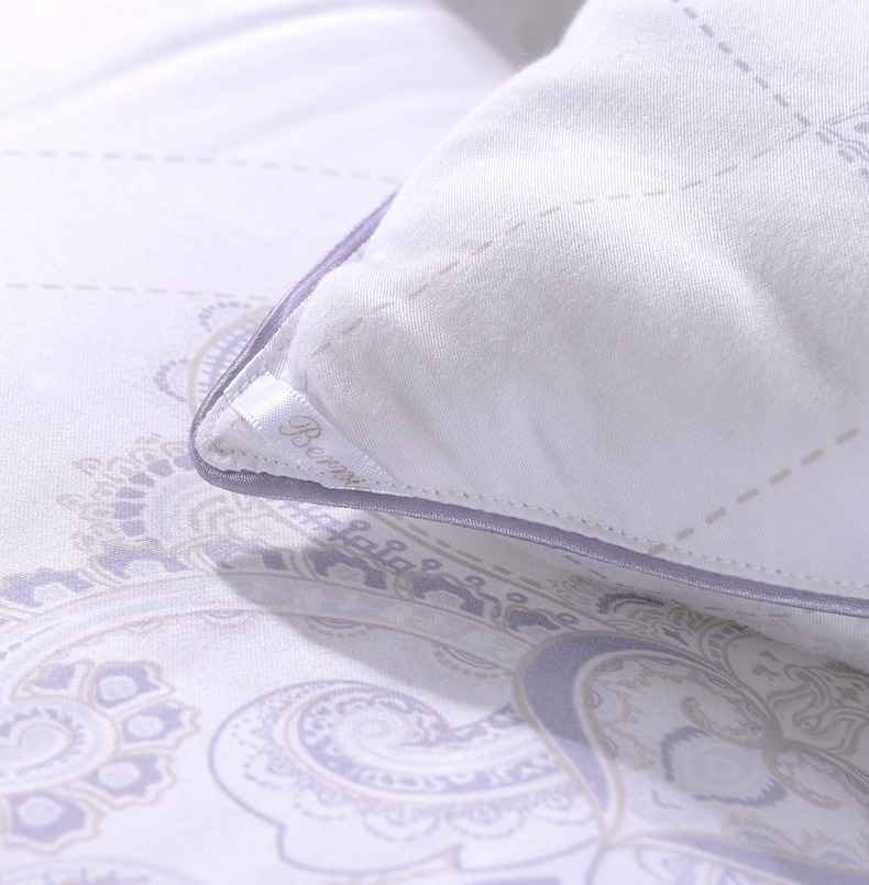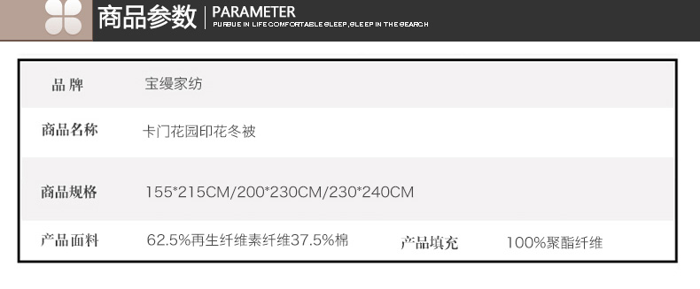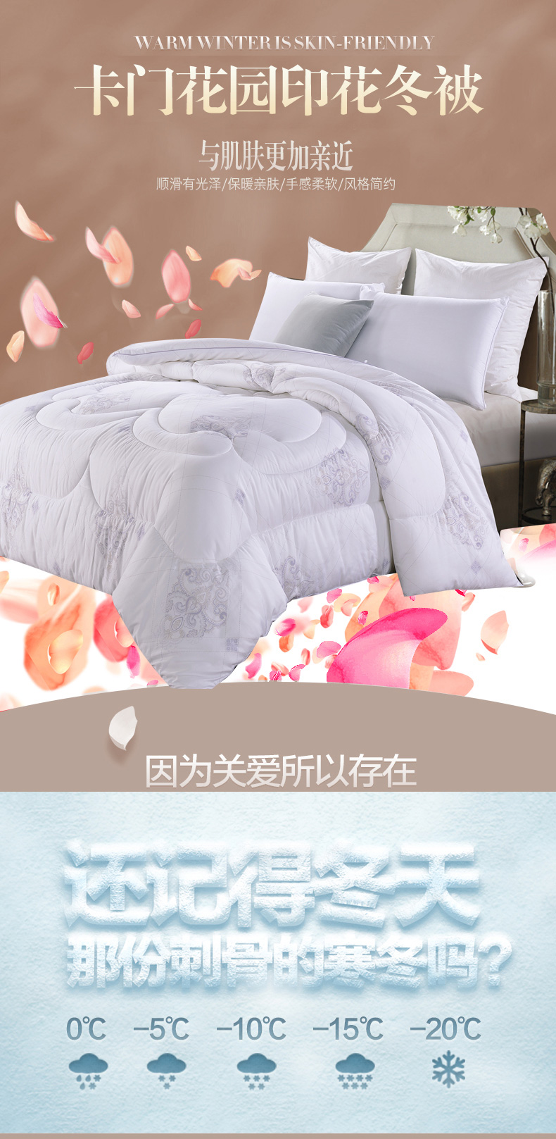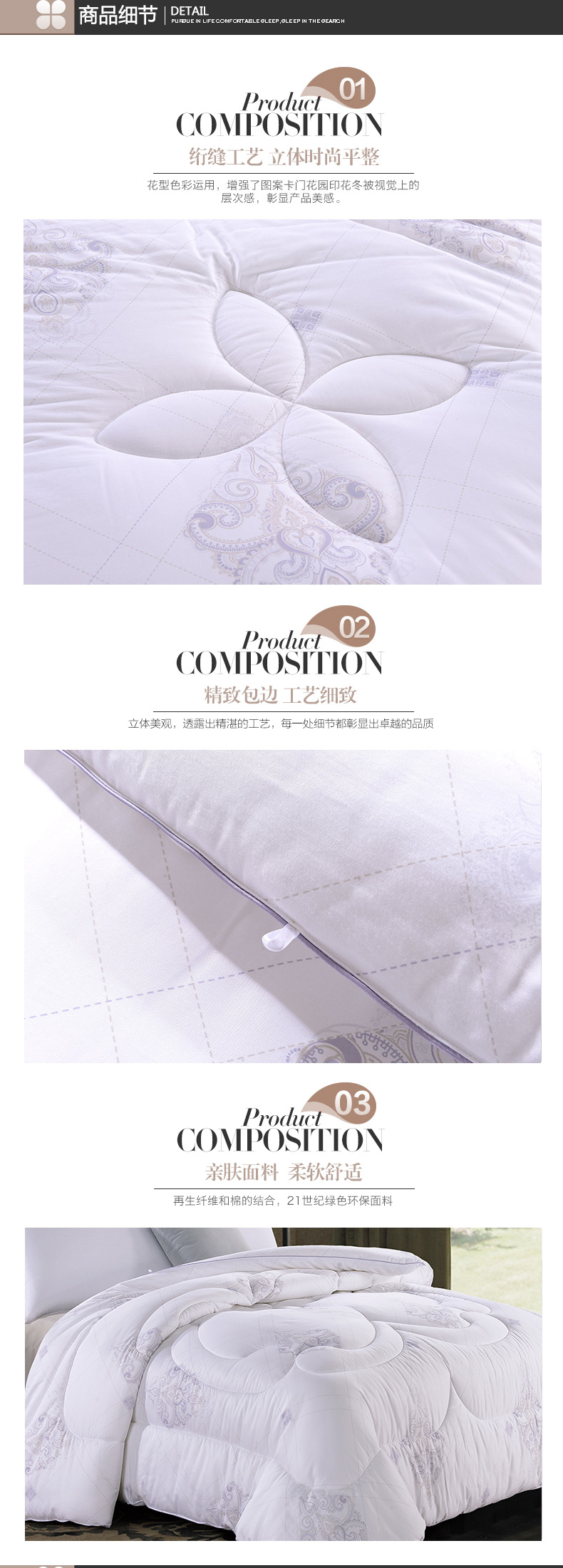 產(chǎn)品特點:再生纖維和棉的結(jié)合,21世紀(jì)綠色環(huán)保面料?;ㄐ蜕蔬\用,增強了圖案卡門花園印花冬被視覺上的層次感,彰顯產(chǎn)品美感。