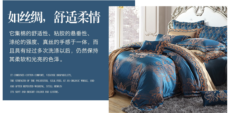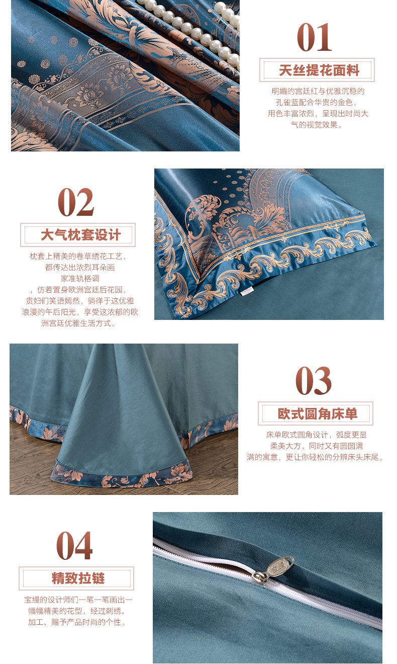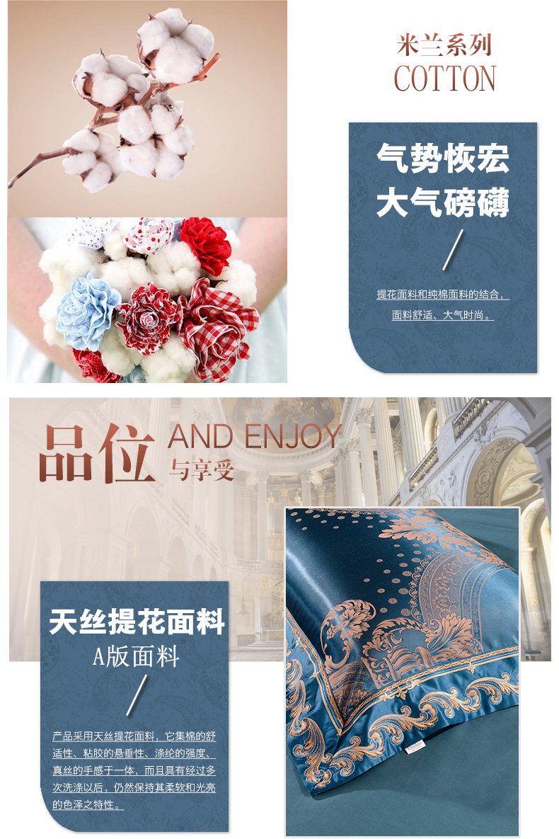 ?產(chǎn)品采用天絲提花面料,它集棉的舒適性、粘膠的懸垂性、滌綸的強(qiáng)度、真絲的手感于一體,而且具有經(jīng)過多次洗滌以后,仍然保持其柔軟和光亮的色澤之特性。