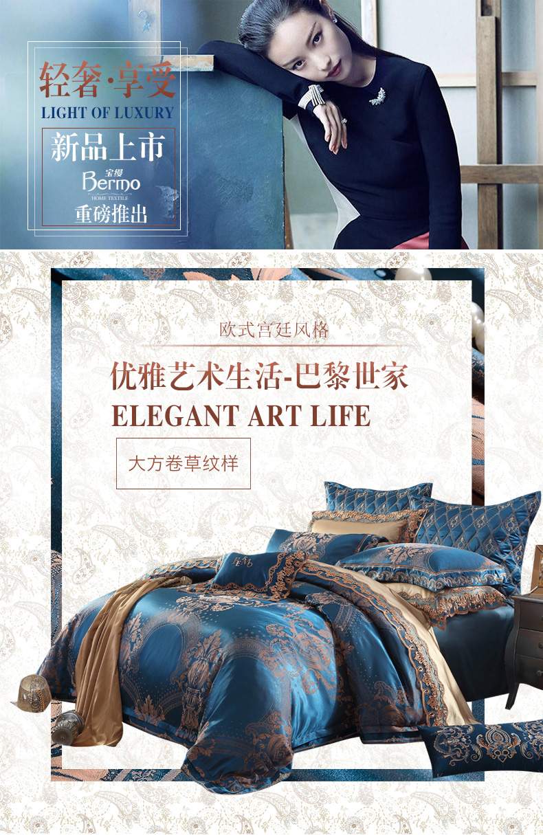 ?不是好貨不推薦,今天為你推薦的是寶縵家紡2016秋冬米蘭系列主推品---巴黎世家!產(chǎn)品設(shè)計靈感來源于歐洲的古典金質(zhì)獎杯,象征著皇家尊貴與最高榮譽(yù),結(jié)合歐式穹頂元素,氣勢恢宏大氣磅礴又不失精致細(xì)節(jié),凸顯典雅奢華的生活氛圍。