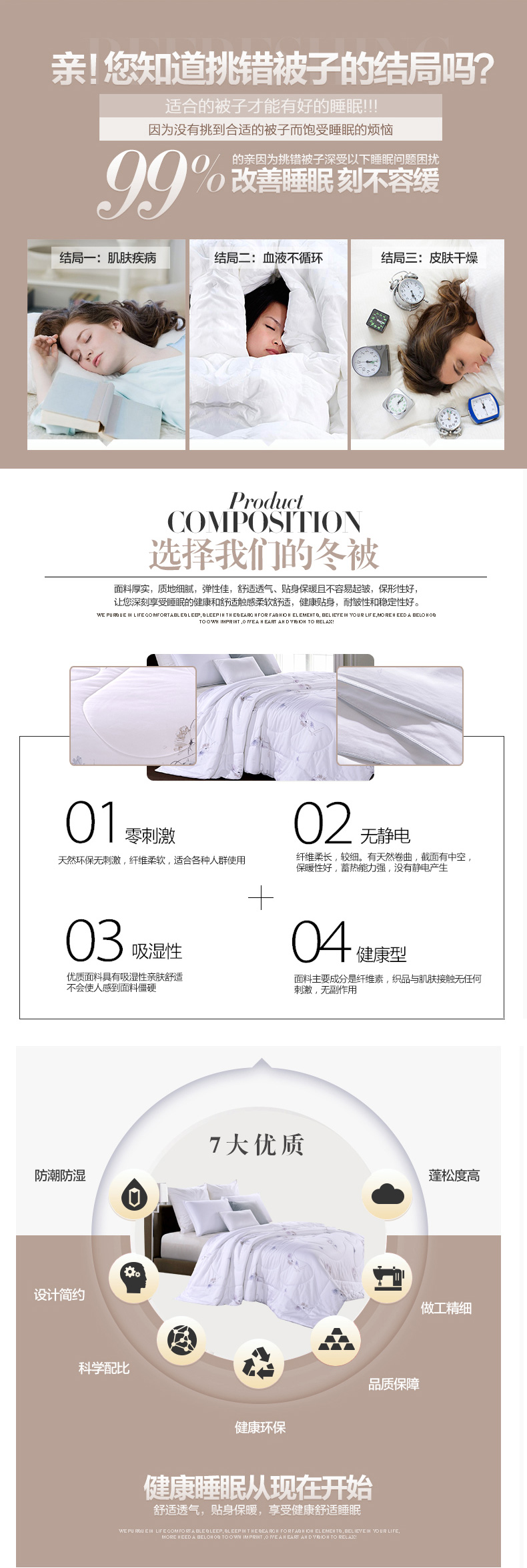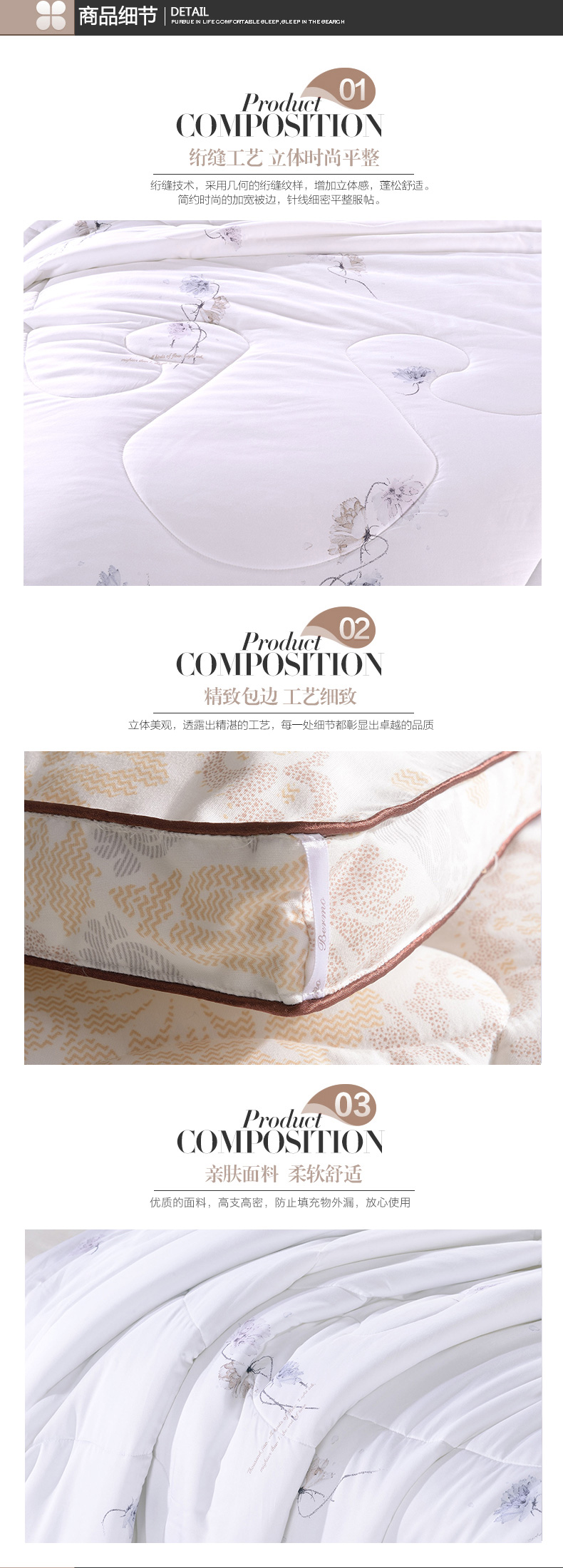 工藝:精美的絎縫技術,固定內(nèi)芯,形成固定蓬松點,使得內(nèi)部填充更加蓬松。四周筋條固邊,固定更精密。