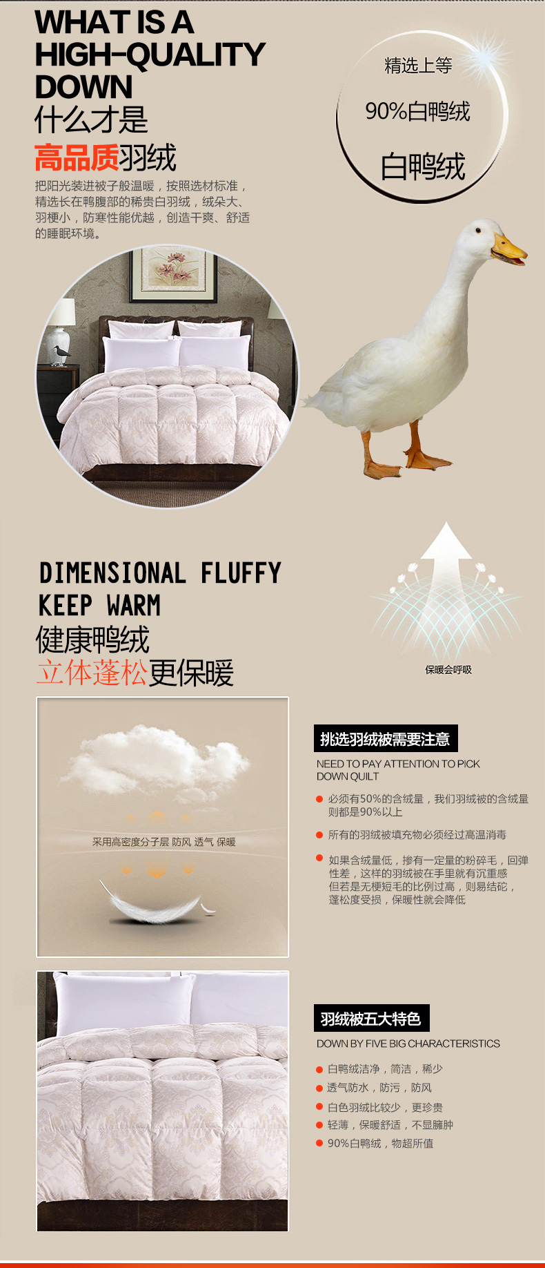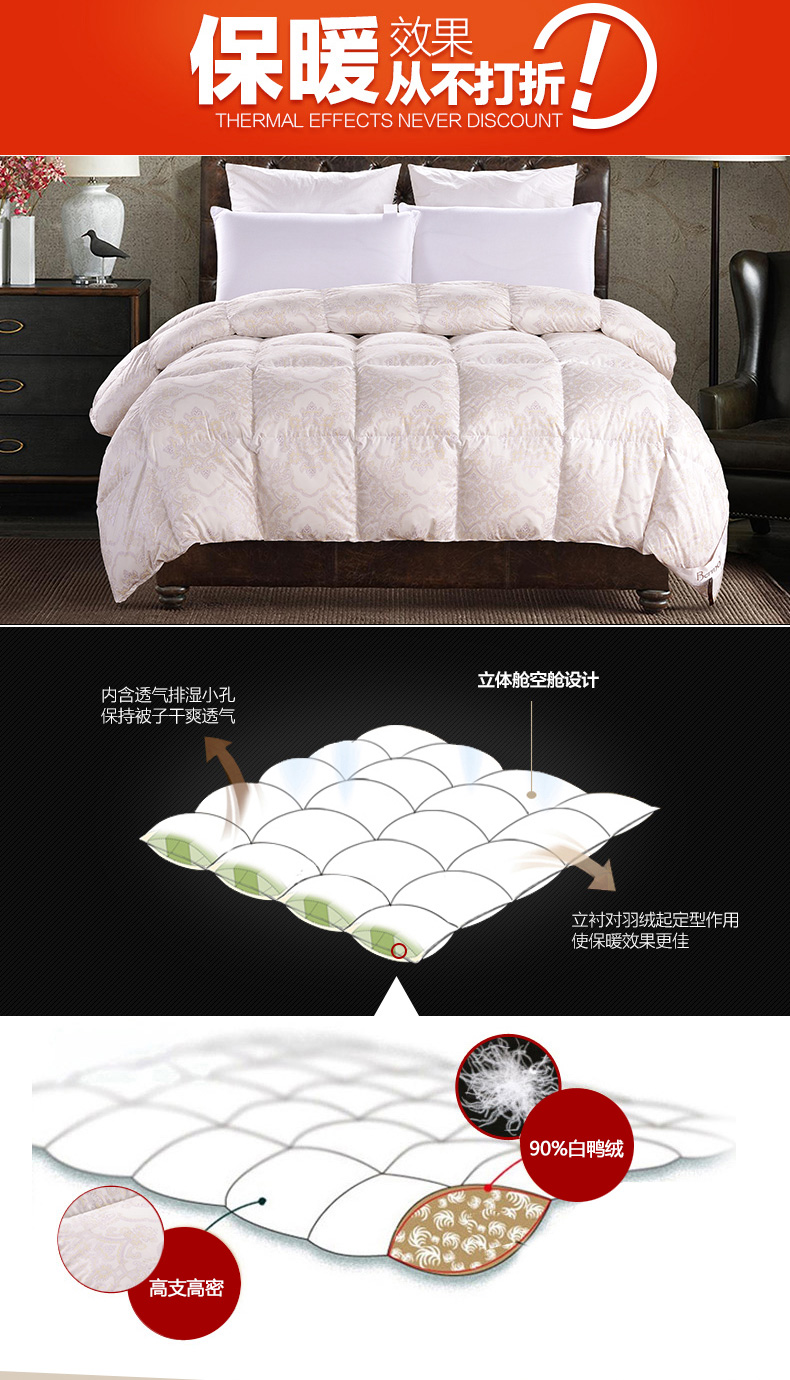 產(chǎn)品特點(diǎn):把陽(yáng)光裝進(jìn)被子般溫暖,按照國(guó)標(biāo)選材標(biāo)準(zhǔn),精選長(zhǎng)在鴨腹部的稀貴白羽絨,絨朵大、羽梗小,防寒性能優(yōu)越,創(chuàng)造干爽、舒適的睡眠環(huán)境。