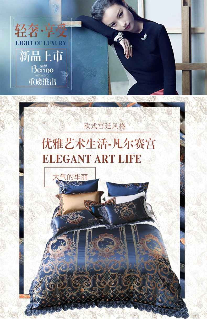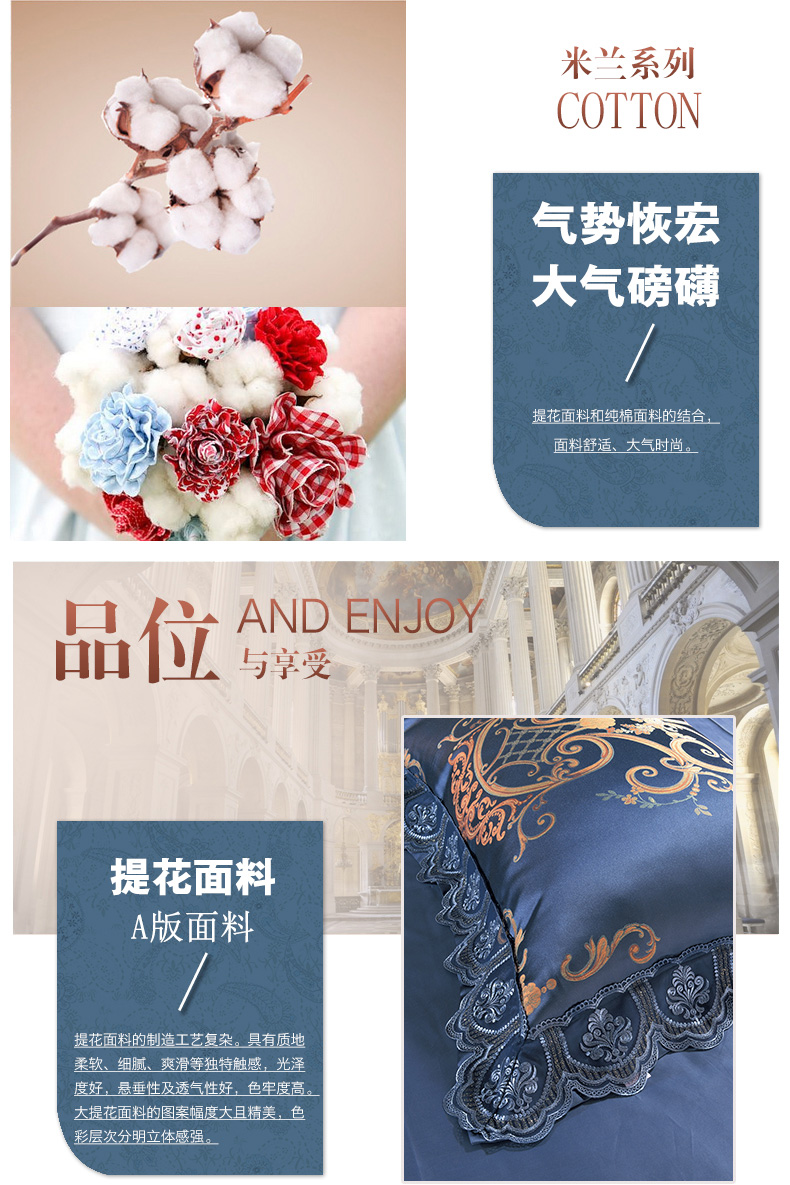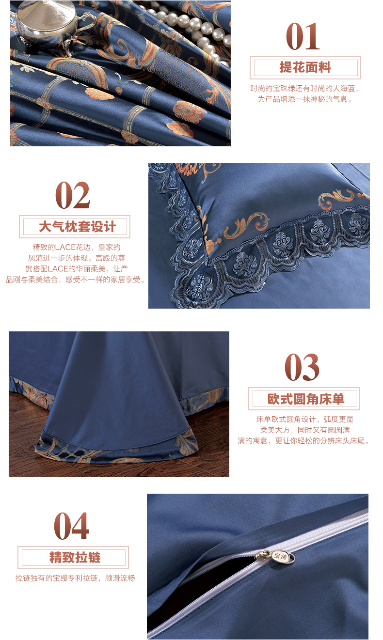 第一:產(chǎn)品特別加入精致的lace花邊,皇家的風(fēng)范進(jìn)一步的體現(xiàn)。宮殿的尊貴搭配lace的華麗柔美,讓產(chǎn)品剛與柔美結(jié)合,感受不一樣的家居享受。