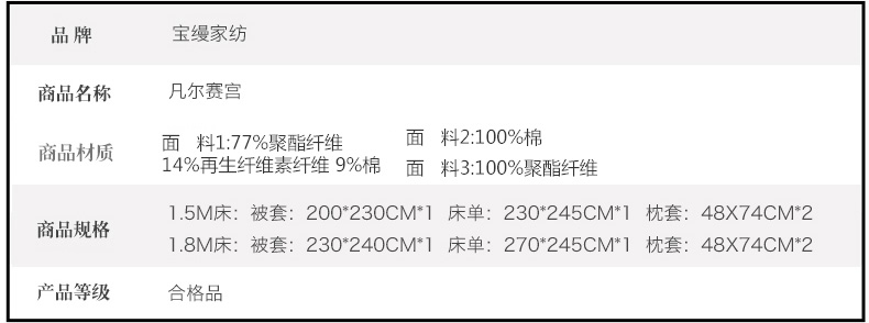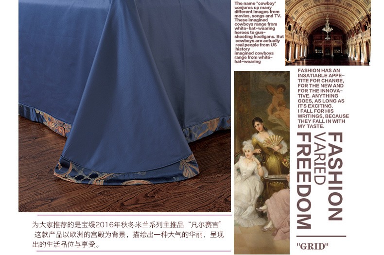 色彩生活,寶縵家紡!今天為大家推薦的是寶縵2016年秋冬米蘭系列主推品“凡爾賽宮”, 這款產(chǎn)品以歐洲的宮殿為背景,描繪出一種大氣的華麗,呈現(xiàn)出極致的生活品位與享受。產(chǎn)品選用高支高密的提花面料,其質(zhì)地細(xì)膩,柔韌性強(qiáng),垂感好,光澤度可以與真絲相媲美。