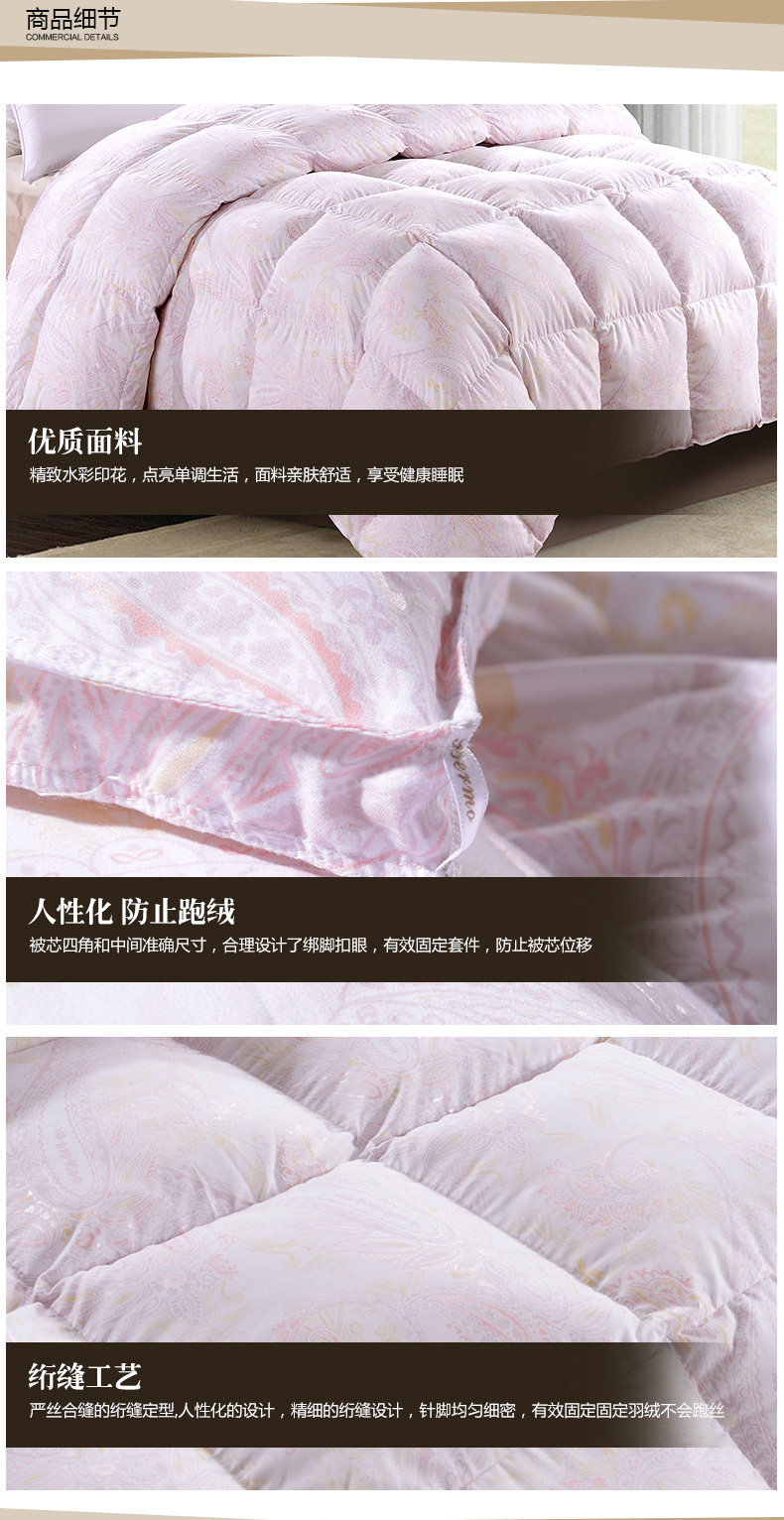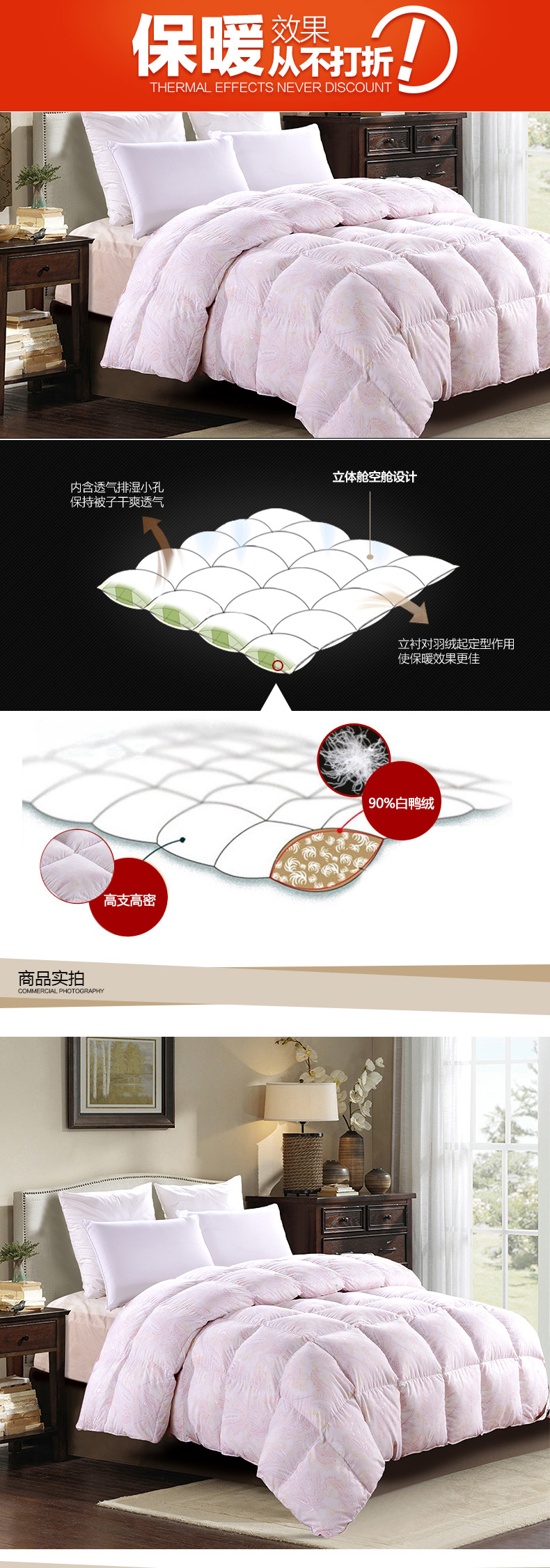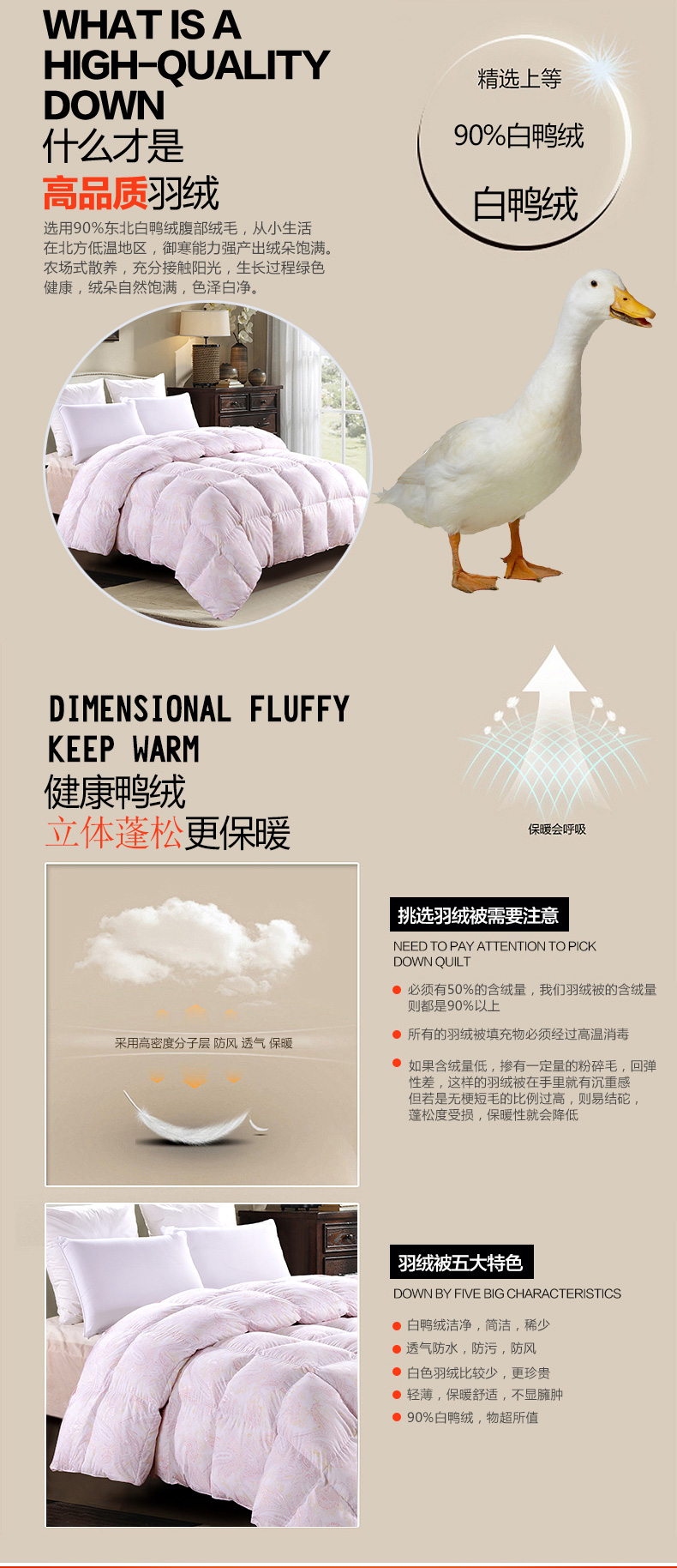 選用90%東北白鴨絨腹部絨毛,從小生活在北方低溫地區(qū),御寒能力強(qiáng)產(chǎn)出絨朵飽滿。農(nóng)場(chǎng)式散養(yǎng),充分接觸陽(yáng)光,生長(zhǎng)過(guò)程綠色健康,絨朵自然飽滿,色澤白凈。