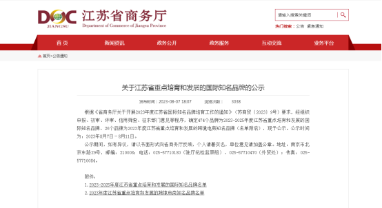 2023年8月7日,江蘇省商務(wù)廳發(fā)布《關(guān)于江蘇省重點(diǎn)培育和發(fā)展的國際知名品牌的公示》,江蘇寶縵家紡科技有限公司入選“2023-2025年度江蘇省重點(diǎn)培育和發(fā)展的國際知名品牌”。